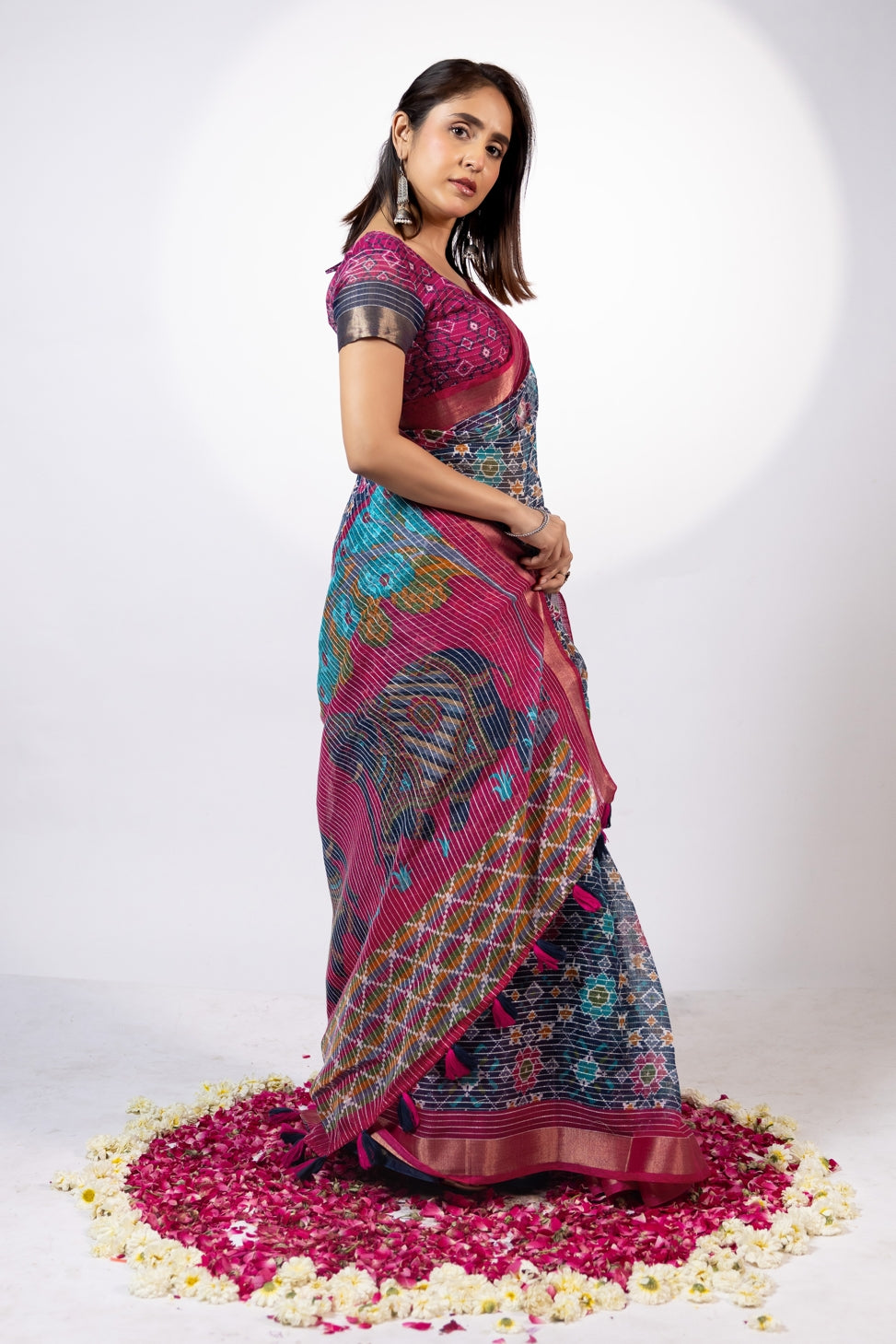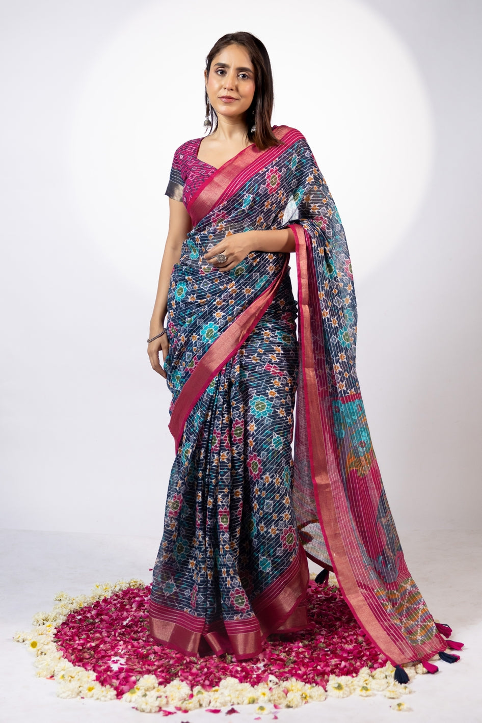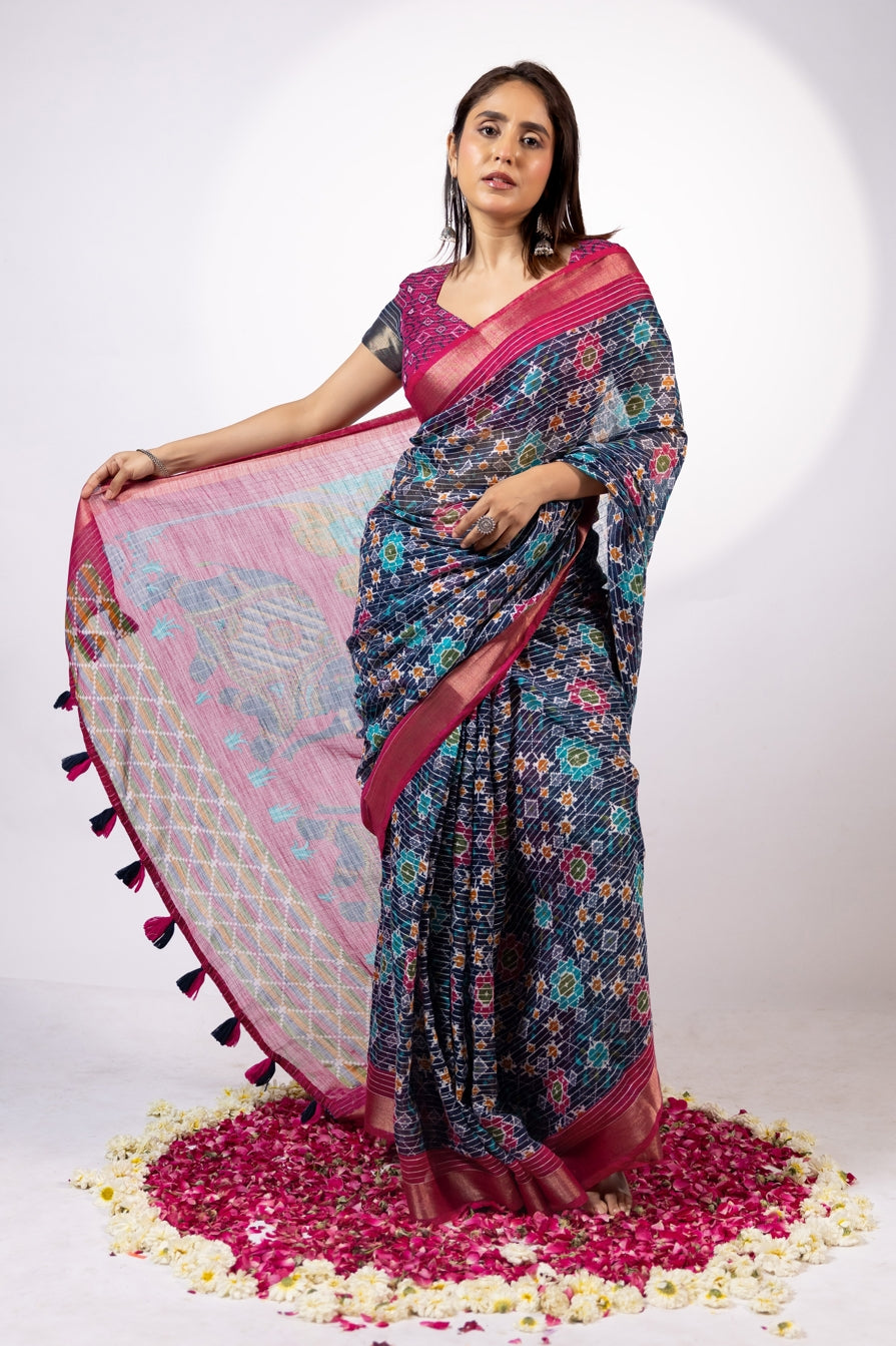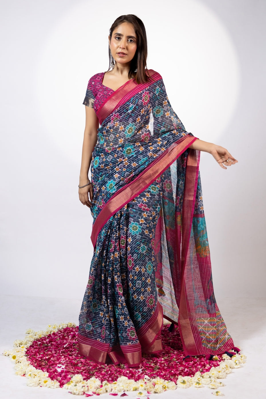 Discover the beauty of tradition with our exquisite cotton blend saree collection. Each saree is made of a Aztec Print with Kantha Work and golden zari woven border from high-quality, breathable cotton, ensuring comfort and style for every occasion. With a range of vibrant colors, intricate patterns, and stunning lace borders, these sarees embody the essence of Indian heritage while being perfect for modern wear. This saree is perfect for everyday wear, whether you’re running errands, attending a family gathering, or having a relaxed summer lunch with friends. .This is also perfect for smaller, less formal festive or cultural events like family get-togethers, poojas, or small celebrations with the stylish prints keep you looking chic.