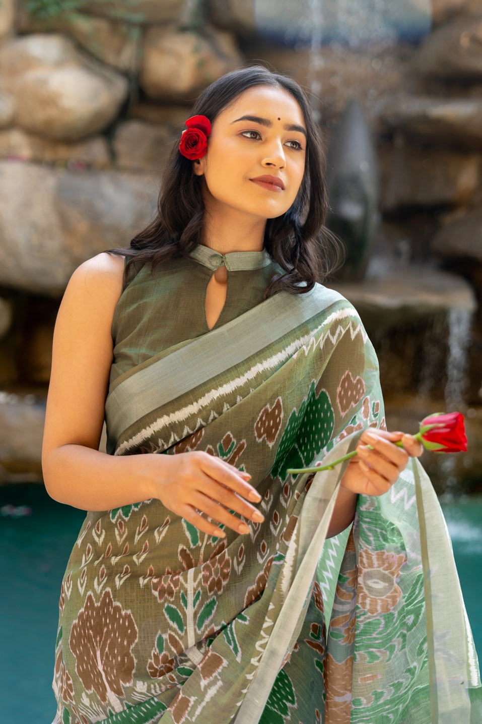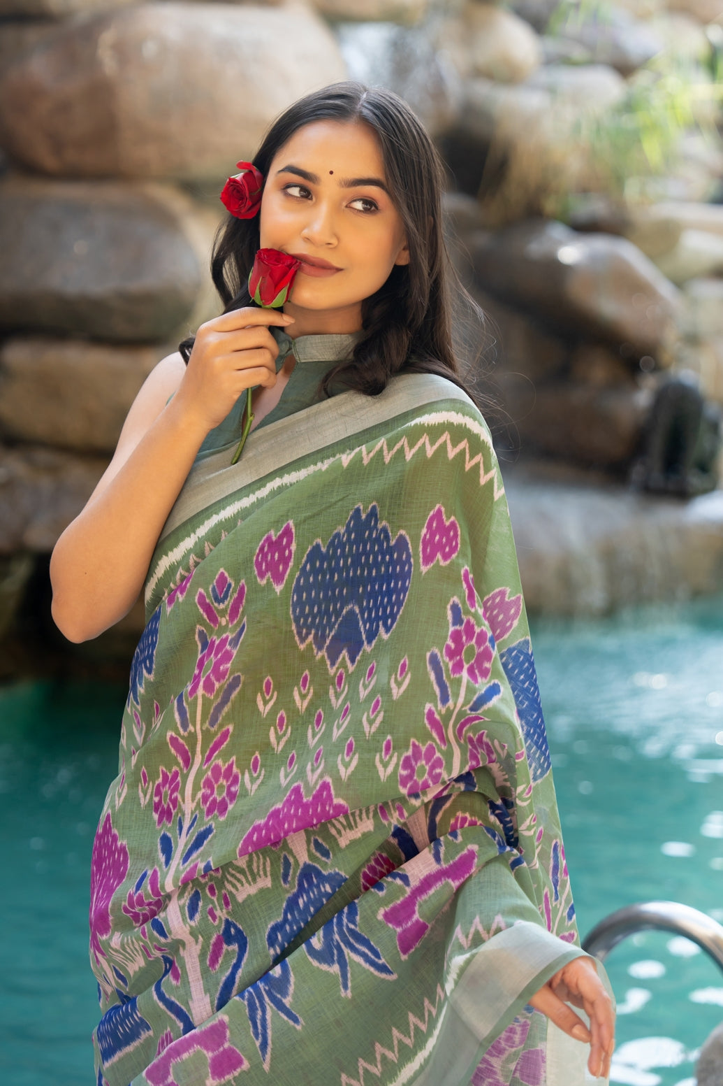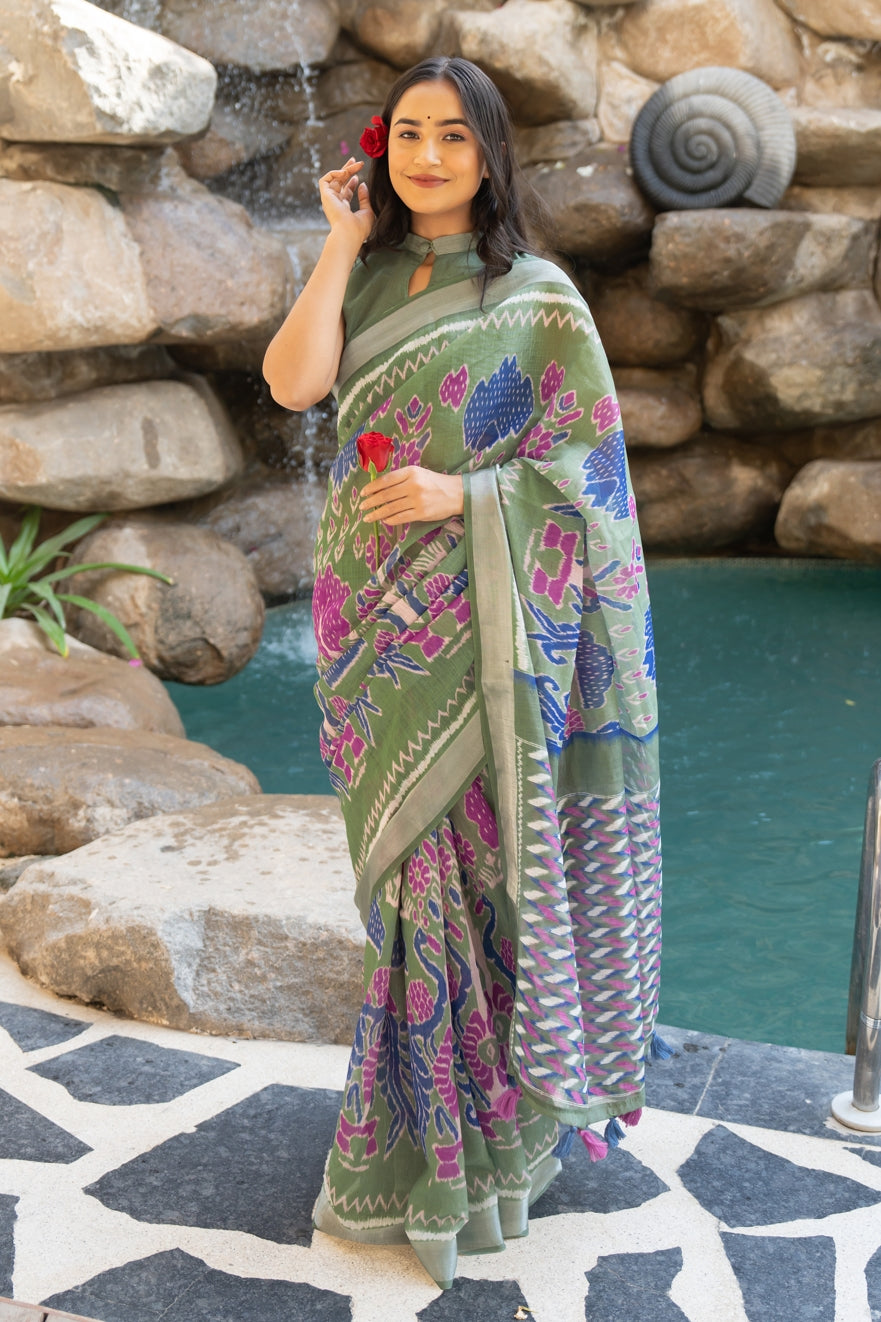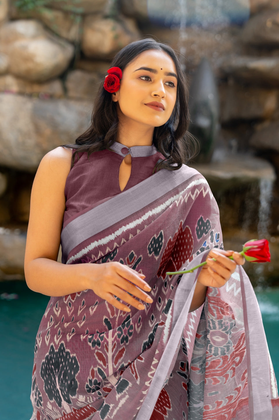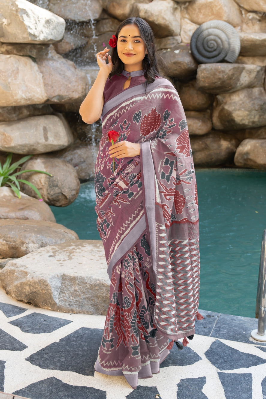 Discover the beauty of tradition with our exquisite cotton blend saree collection. Each saree is made of a Ikkat Print pattern and silver zari border with tassels from high-quality, breathable cotton, ensuring comfort and style for every occasion. With a range of vibrant colors, intricate patterns, and stunning lace borders, these sarees embody the essence of Indian heritage while being perfect for modern wear. This saree is perfect for everyday wear, whether you’re running errands, attending a family gathering, or having a relaxed summer lunch with friends. .This is also perfect for smaller, less formal festive or cultural events like family get-togethers, poojas, or small celebrations with the stylish prints keep you looking chic.
