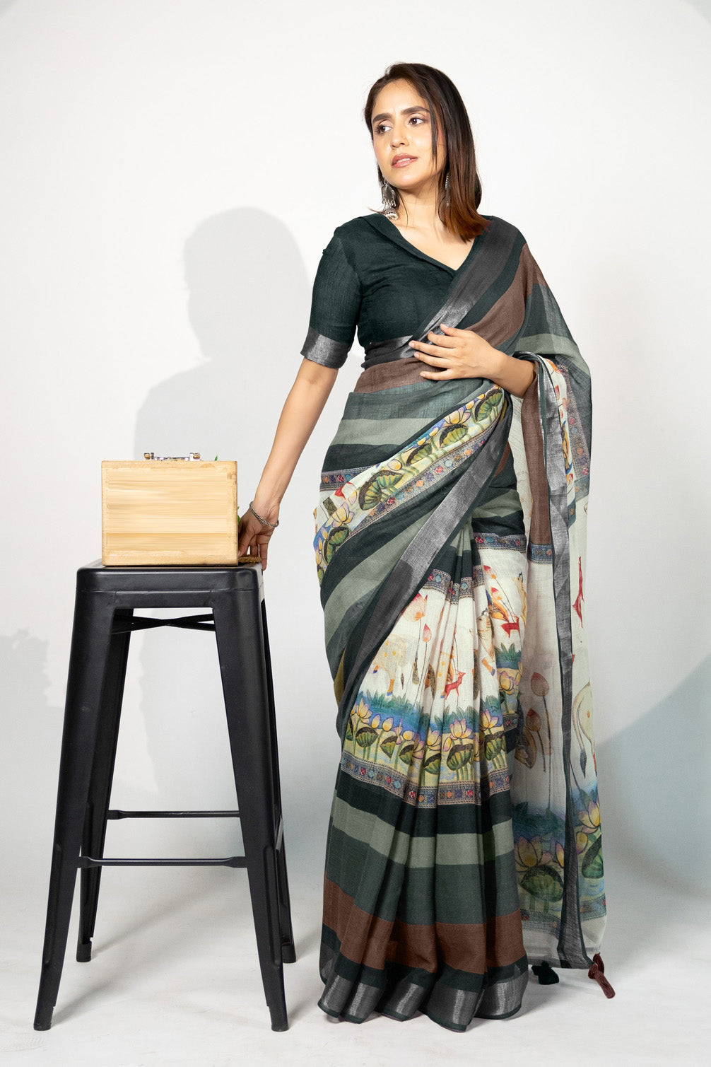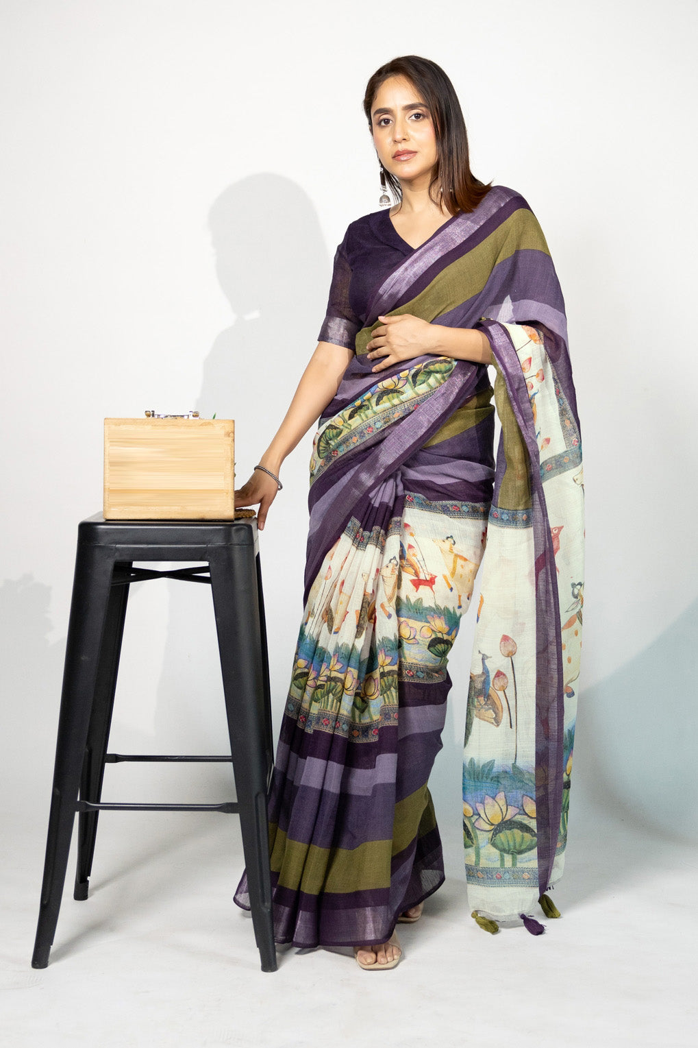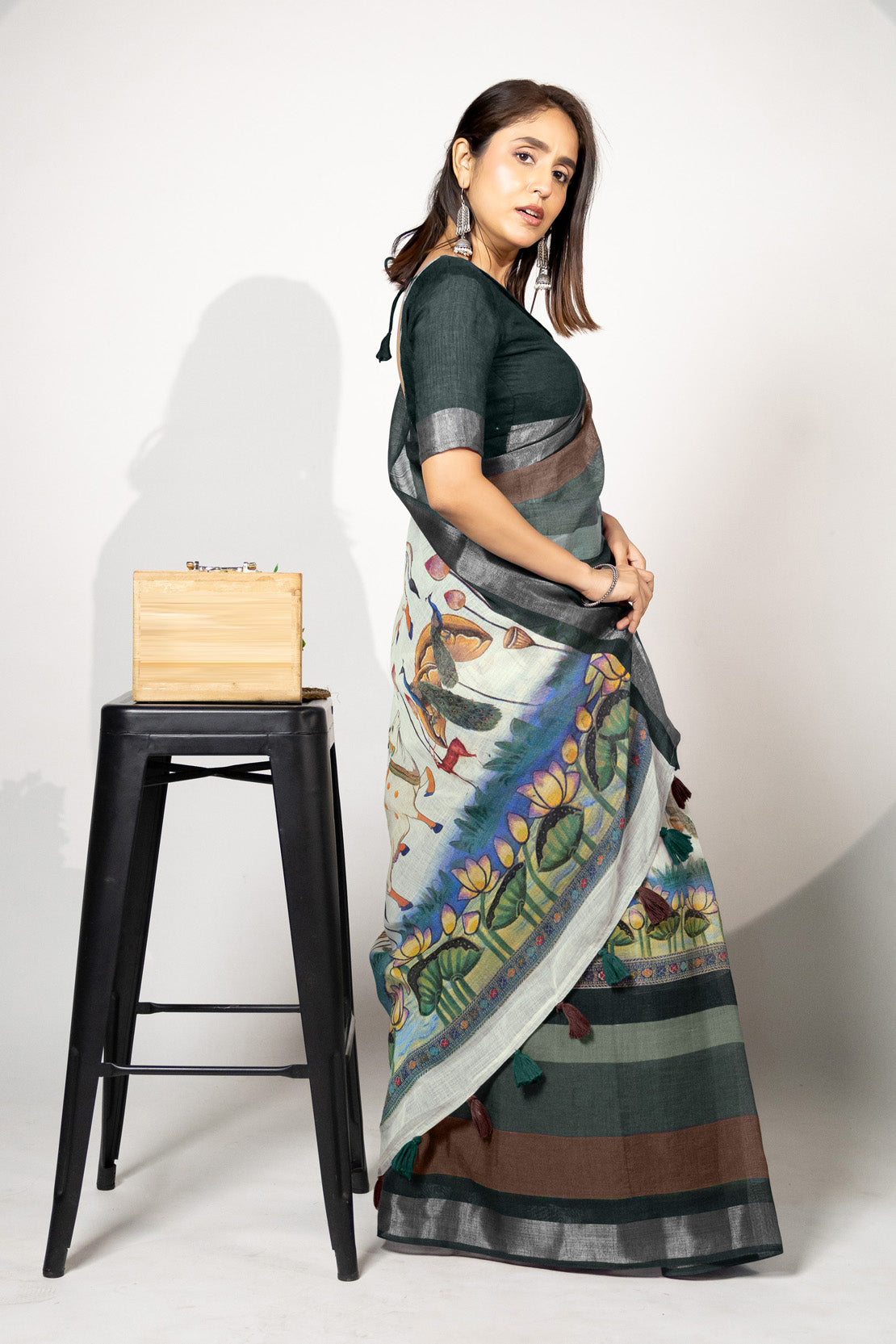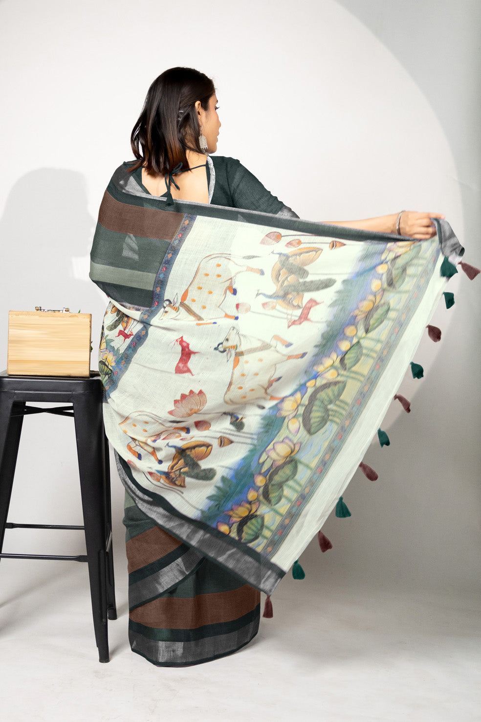 Discover the beauty of tradition with our exquisite cotton blend saree collection. Each saree is made of a Madhubani Print pattern and silver zari border with tassels from high-quality, breathable cotton, ensuring comfort and style for every occasion. With a range of vibrant colors, intricate patterns, and stunning lace borders, these sarees embody the essence of Indian heritage while being perfect for modern wear. This saree is perfect for everyday wear, whether you’re running errands, attending a family gathering, or having a relaxed summer lunch with friends. .This is also perfect for smaller, less formal festive or cultural events like family get-togethers, poojas, or small celebrations with the stylish prints keep you looking chic.