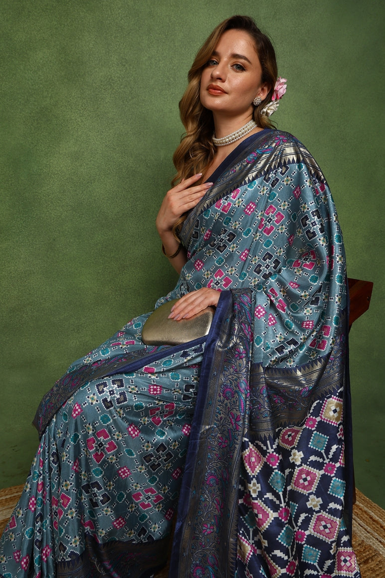 A patola foil print saree with golden zari woven border details blends the softness and breeziness of foil patterns with the intricate artistry of golden zari woven border, making it a truly unique and stylish choice. Accompanied by a 0.8-meter blouse piece that can be tailored to your exact size and fit, this saree ensures a custom-made and flawless appearance. This combination of foil patola prints and tassels details makes the saree perfect for daytime events like garden parties, brunches, or weddings, where a fresh, light, and sophisticated look is desired.