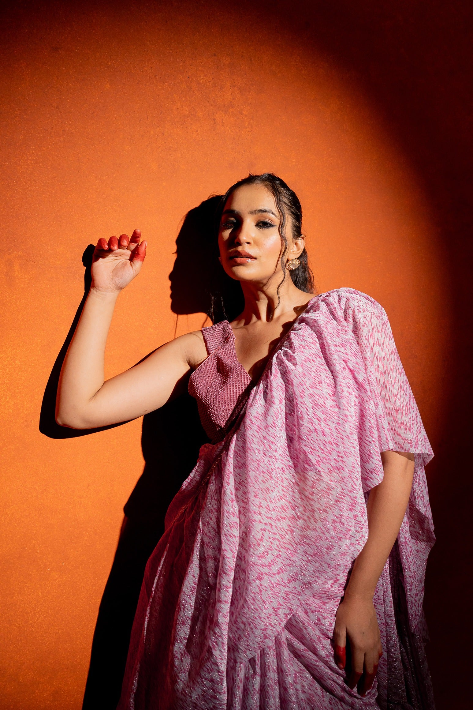 The ready-to-wear saree features a modern frill ruffled design that adds a playful yet sophisticated touch. The frills enhance the saree's overall look, making it perfect for cocktails, weddings, and special occasion parties. Adorned with subtle embellishments, this saree sparkles with sophistication and adds a touch of glamour, ensuring you shine at any event. The lycra fabric ensures maximum comfort and flexibility, allowing you to move with ease and confidence. Its lightweight nature makes it ideal for extended wear.