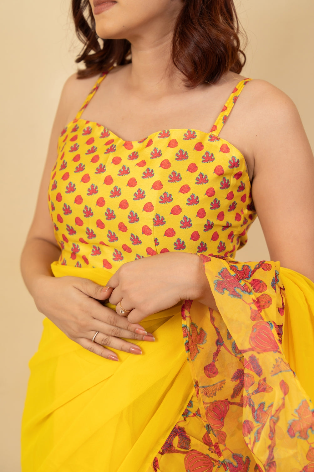 The ready-to-wear saree features a modern frill ruffled design that adds a playful yet sophisticated touch. The frills enhance the saree's overall look, making it perfect for cocktails, weddings, and special occasion parties. Adorned with subtle embellishments, this saree sparkles with sophistication and adds a touch of glamour, ensuring you shine at any event. The georgette fabric ensures maximum comfort and flexibility, allowing you to move with ease and confidence. Its lightweight nature makes it ideal for extended wear.