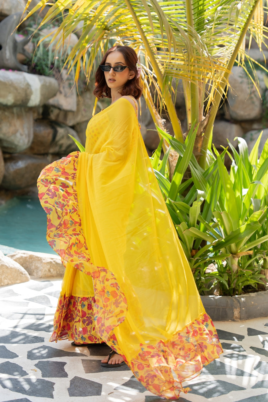 Contemporary Frill Ruffle Floral Printed Georgette Ready-to-wear Saree