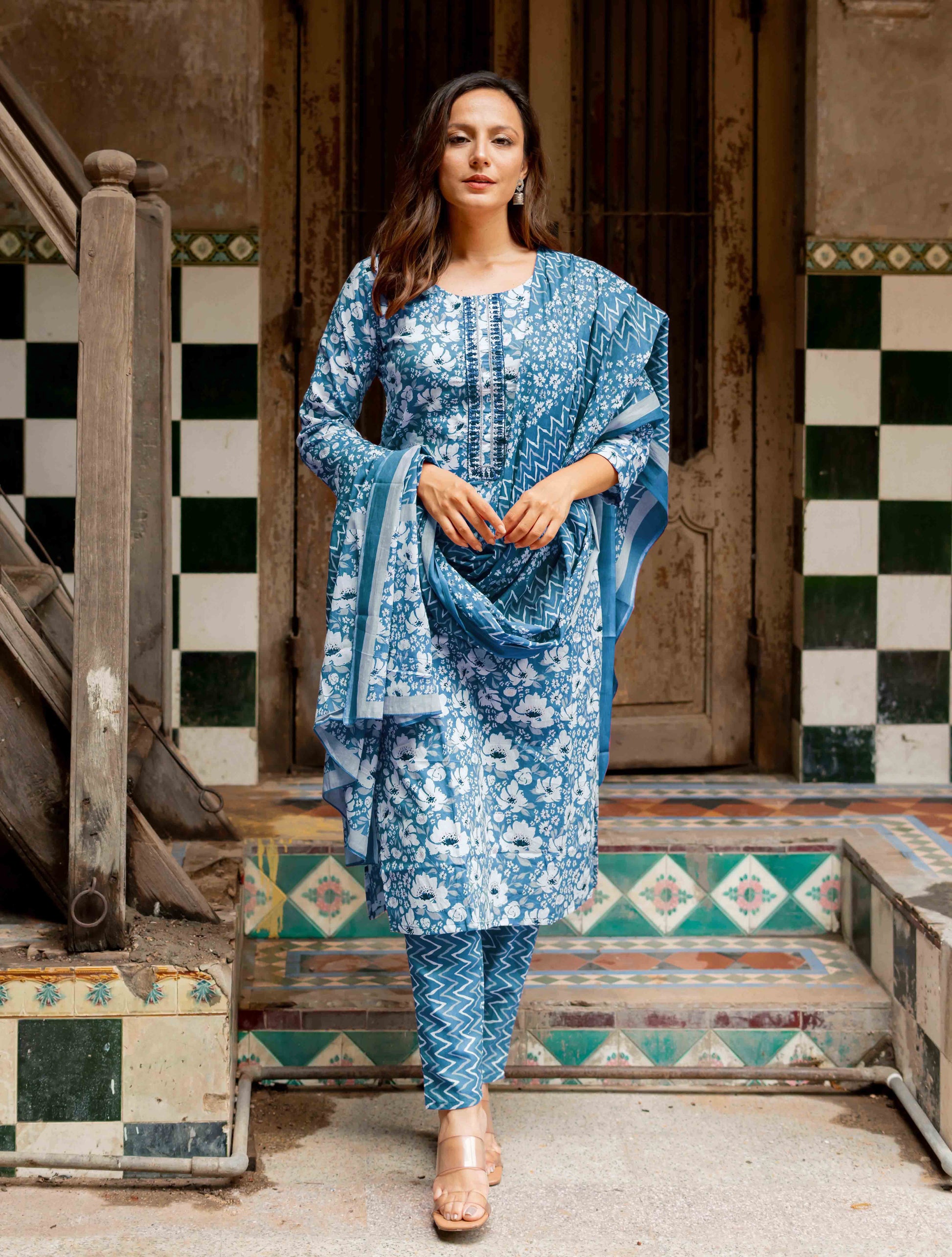 | Elevate your everyday style with this Pure Cotton Floral Printed Kurta Set. The soft, pastel kurta, crafted from breathable cotton, features delicate floral patterns enhanced by embroidery detailing on the front, adding a touch of elegance. Paired with zigzag-print pants, this set brings a perfect blend of tradition and contemporary fashion. The matching dupatta, adorned with subtle floral motifs and chevron borders, completes the look. Ideal for casual outings or office wear or intimate gatherings, this lightweight cotton ensemble offers both comfort and chic style. Step out with confidence in this effortlessly trendy outfit. |