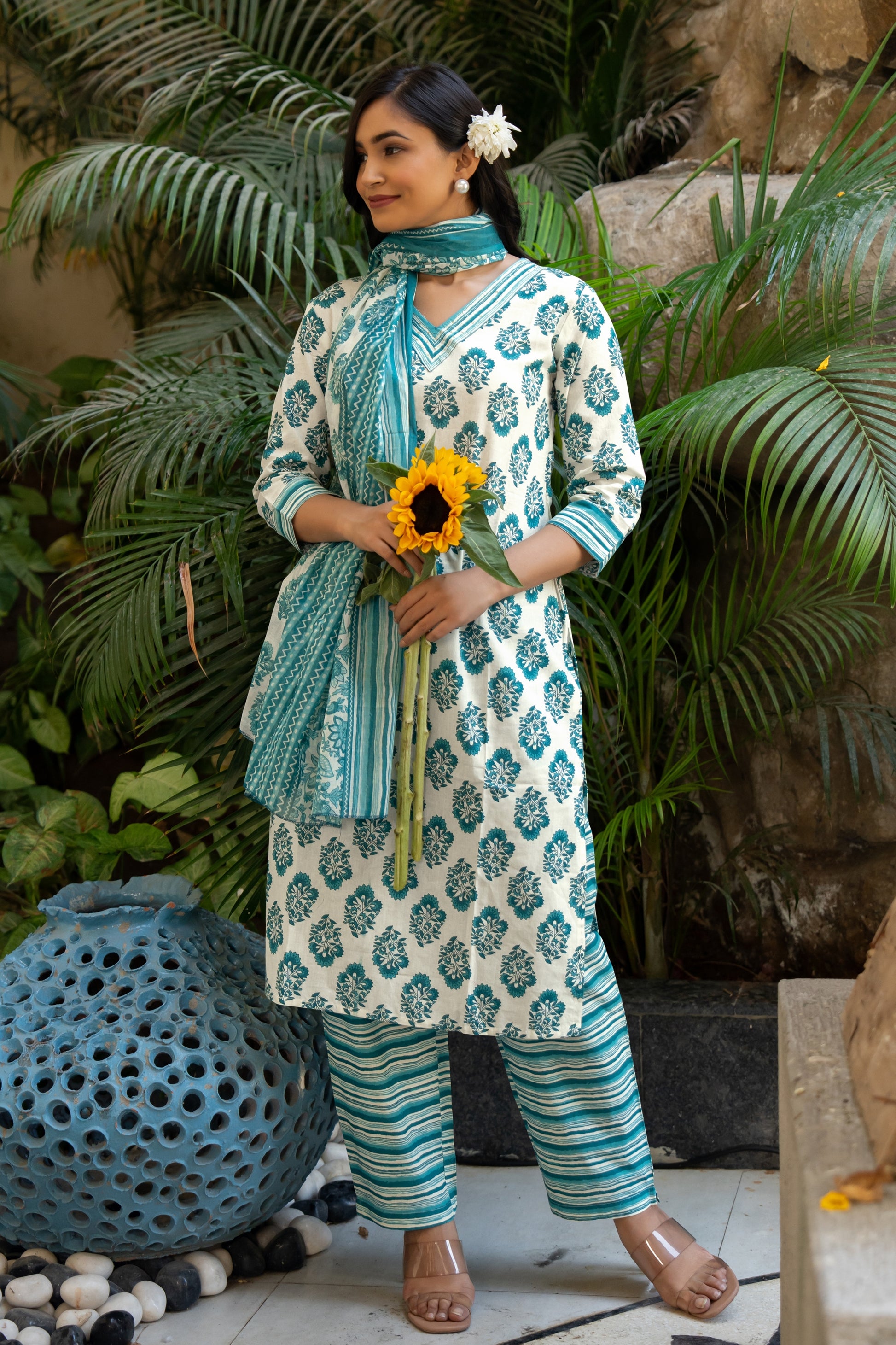 Elevate your everyday style with this Pure Cotton Floral Printed Kurta Set. The soft, pastel kurta, crafted from breathable cotton, features delicate floral patterns enhanced by sequins, silver thread embroidery detailing on the front, adding a touch of elegance. Paired with striped pants, this set brings a perfect blend of tradition and contemporary fashion. The matching dupatta, adorned with subtle floral motifs and stripes borders, completes the look. Ideal for casual outings or office wear or intimate gatherings, this lightweight cotton ensemble offers both comfort and chic style. Step out with confidence in this effortlessly trendy outfit.