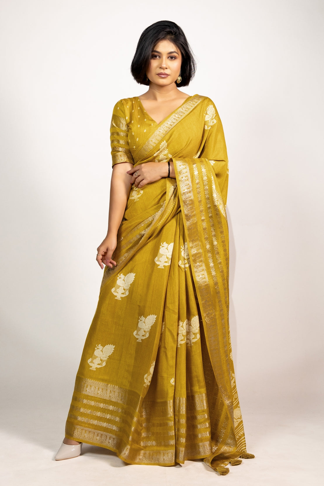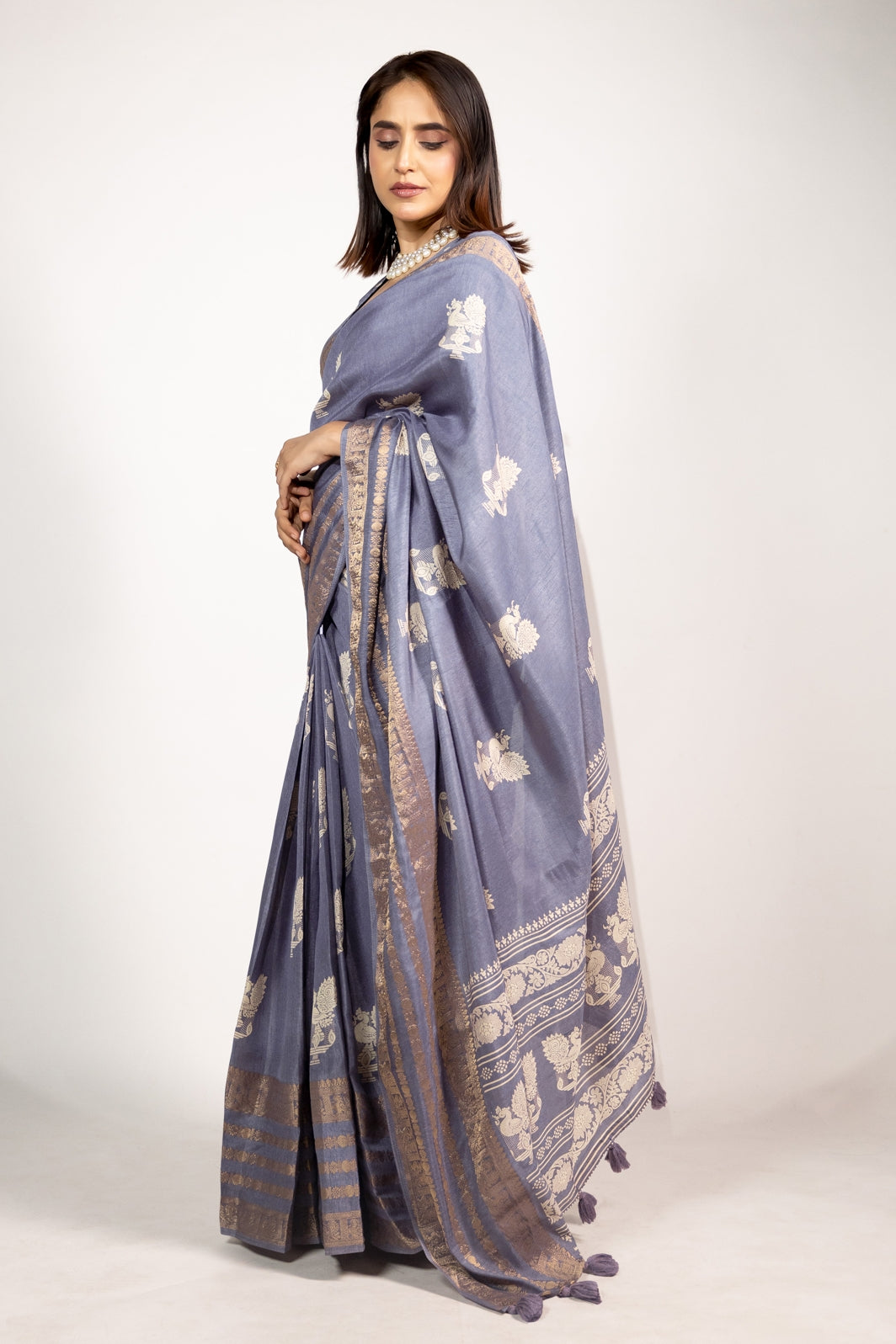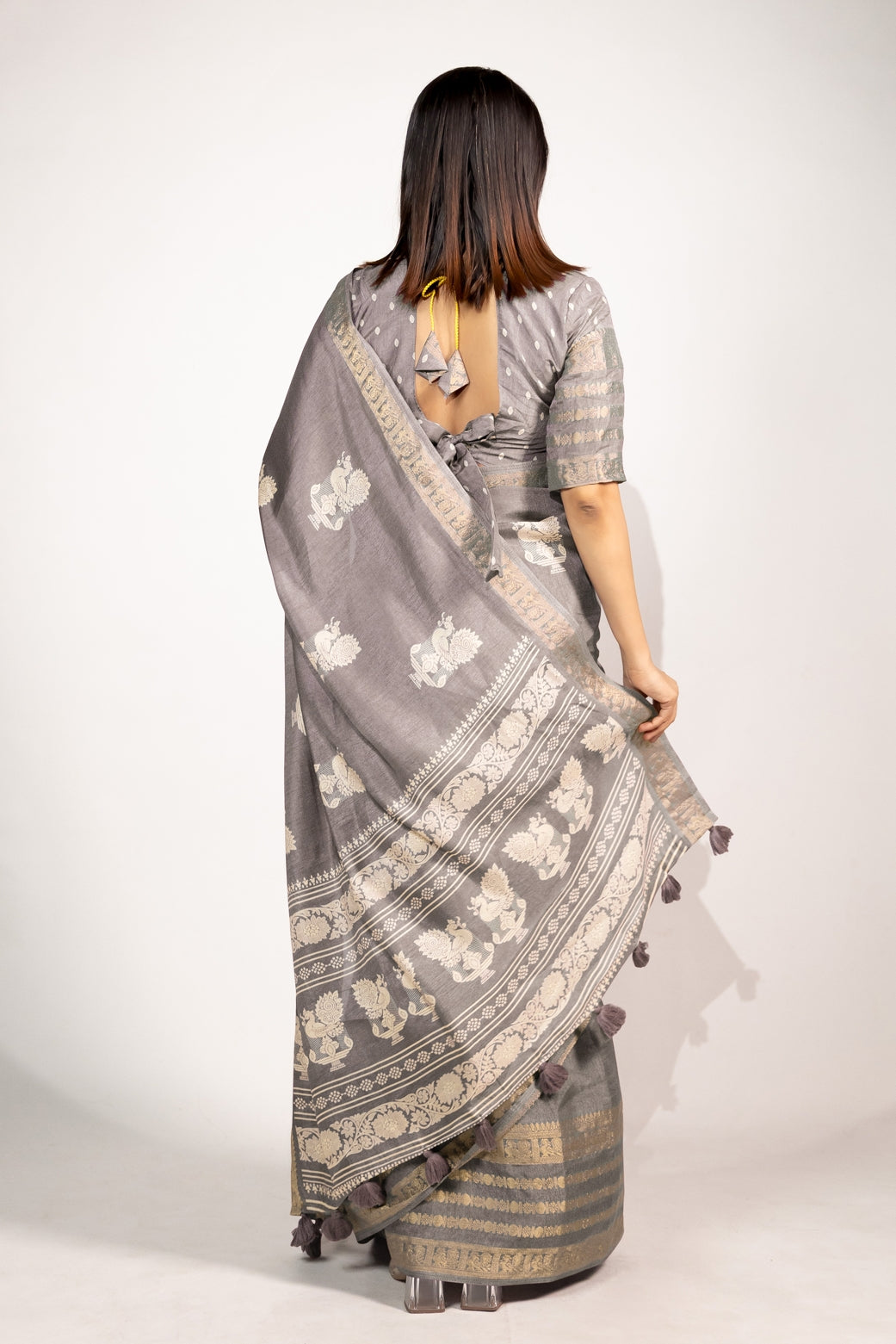 A peacock block print saree with copper zari woven border details blends the softness and breeziness of peacock patterns with the intricate artistry of copper zari woven, making it a truly unique and stylish choice. Accompanied by a 0.8-meter blouse piece that can be tailored to your exact size and fit, this saree ensures a custom-made and flawless appearance. This combination of block prints and tassels details makes the saree perfect for daytime events like garden parties, brunches, or weddings, where a fresh, light, and sophisticated look is desired.