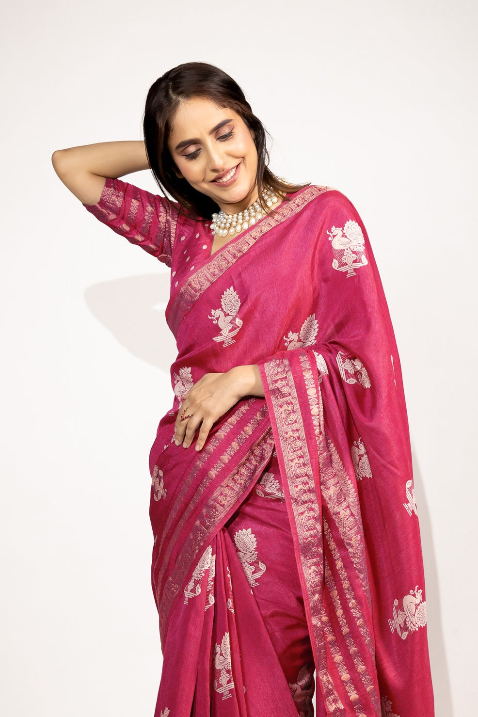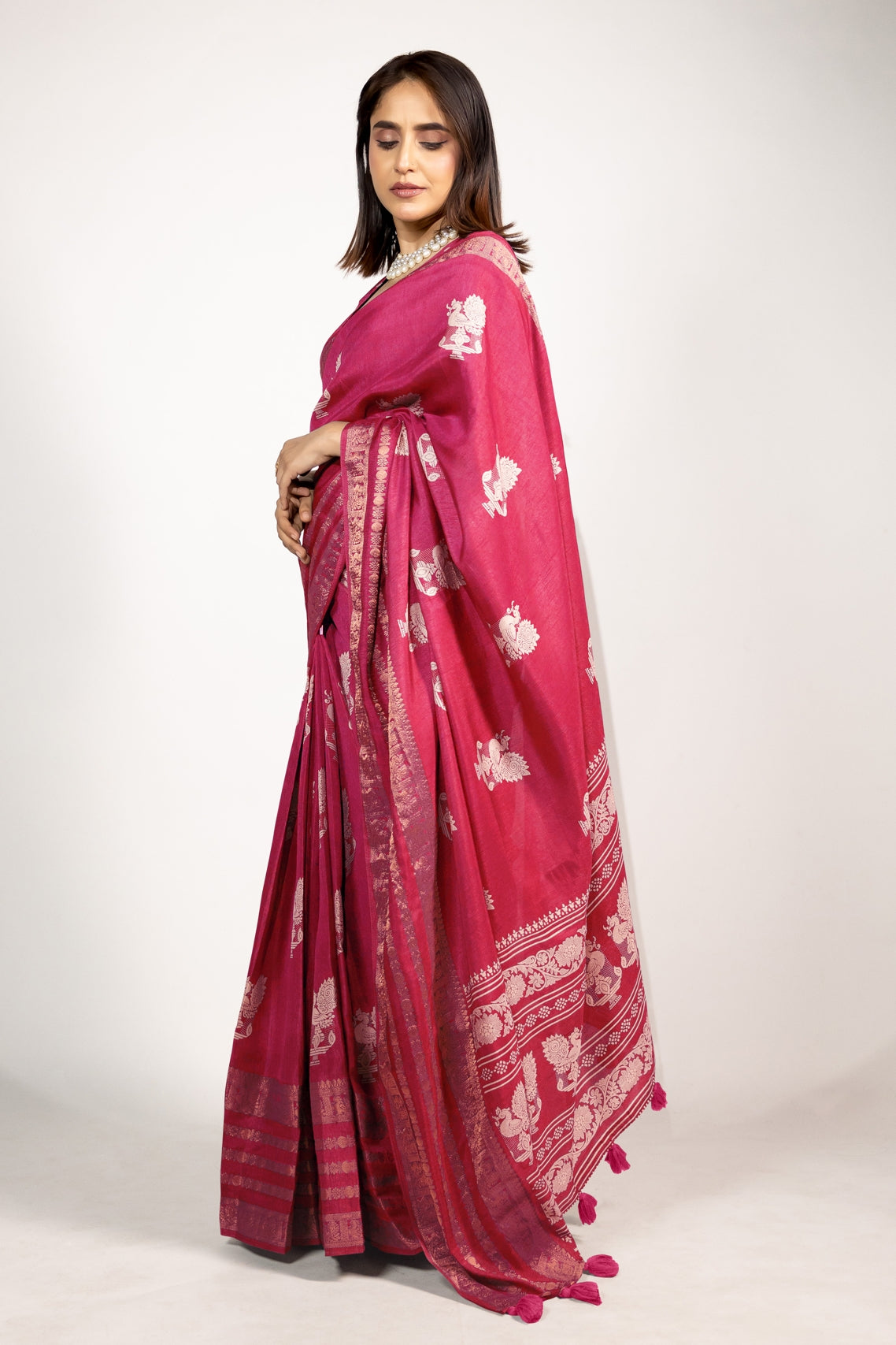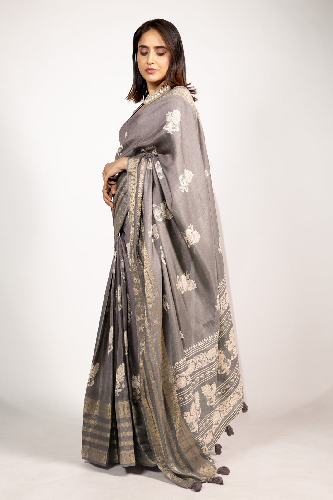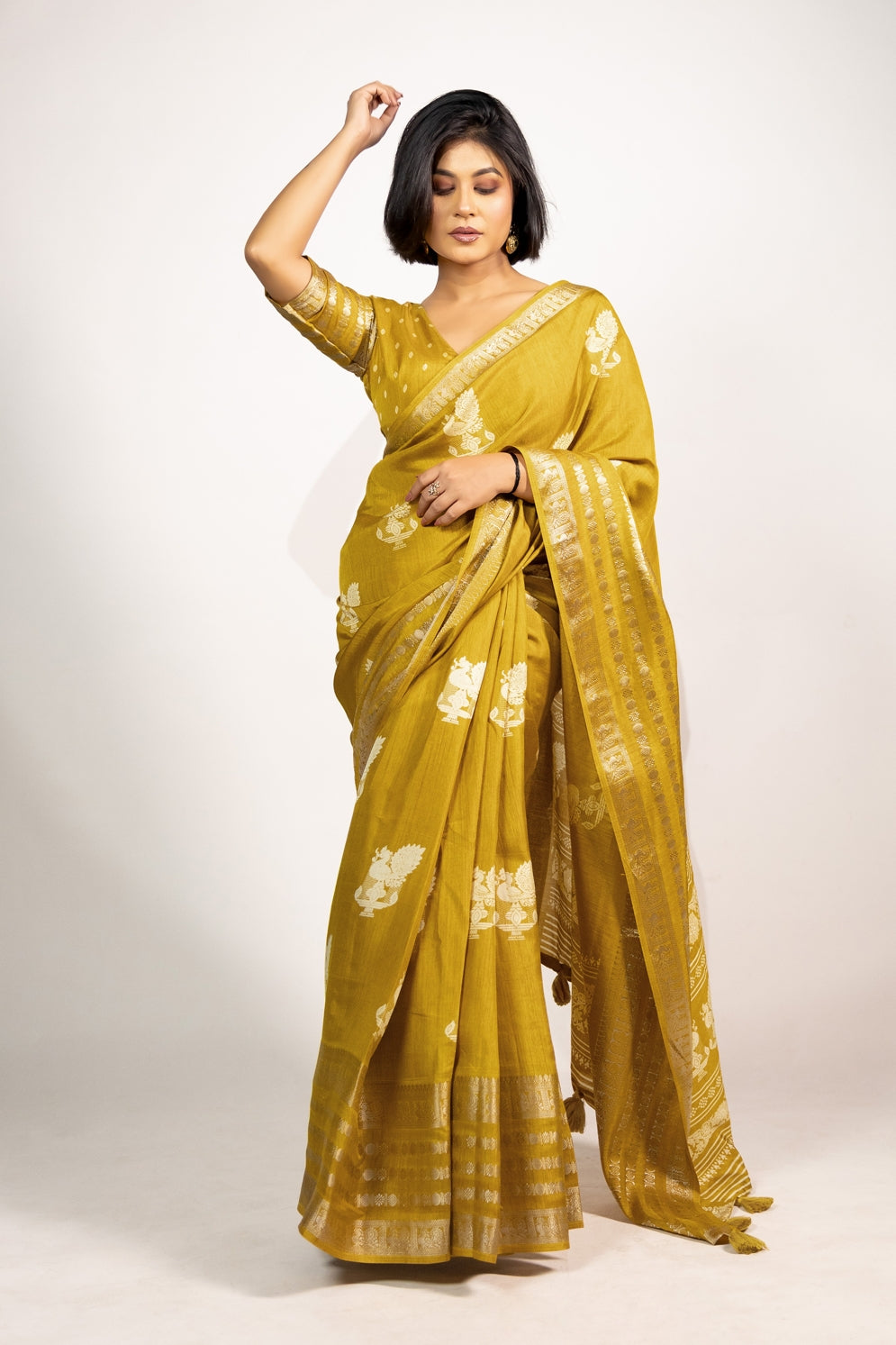 A peacock block print saree with copper zari woven border details blends the softness and breeziness of peacock patterns with the intricate artistry of copper zari woven, making it a truly unique and stylish choice. Accompanied by a 0.8-meter blouse piece that can be tailored to your exact size and fit, this saree ensures a custom-made and flawless appearance. This combination of block prints and tassels details makes the saree perfect for daytime events like garden parties, brunches, or weddings, where a fresh, light, and sophisticated look is desired.
