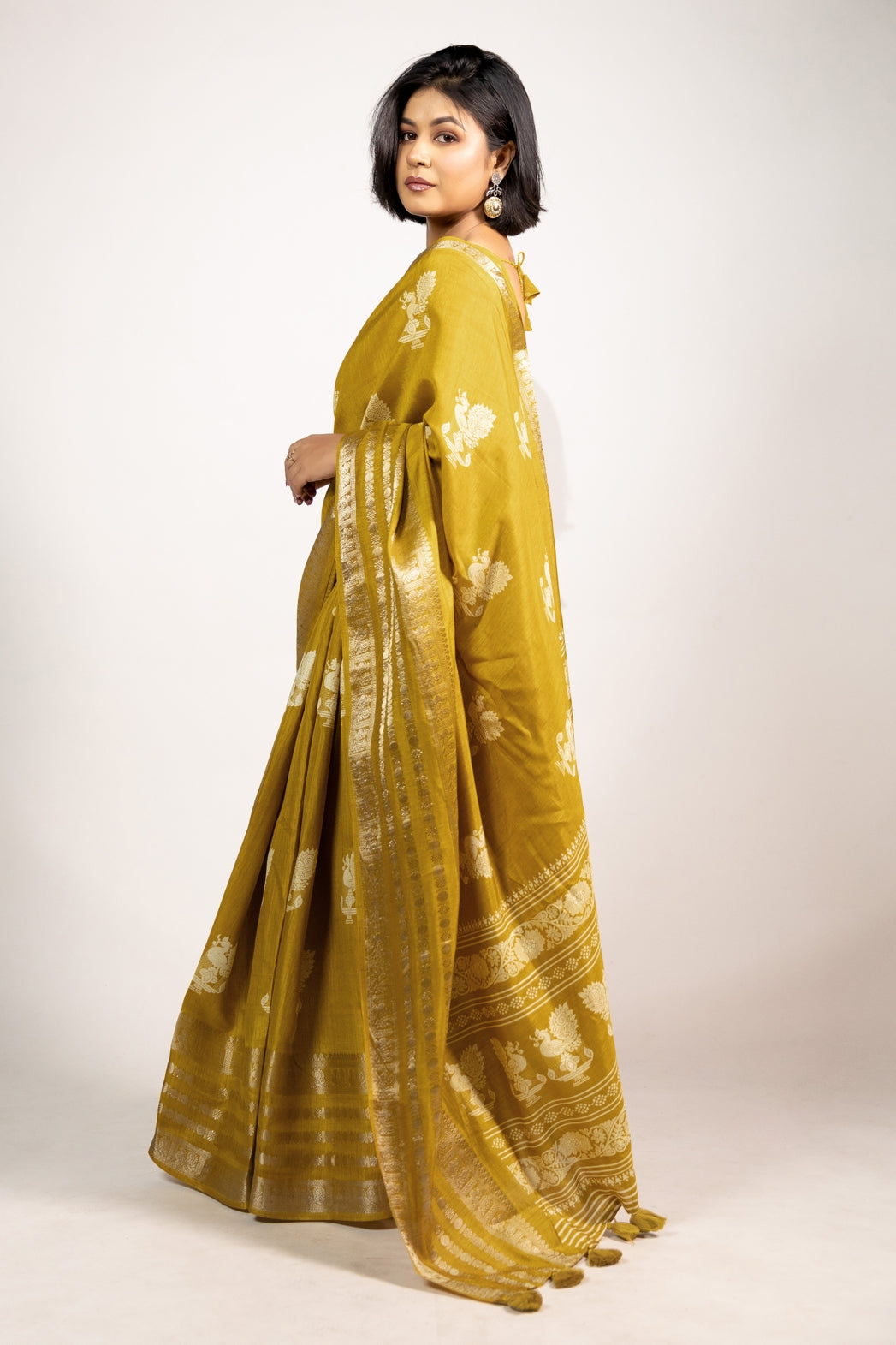 Beautiful Cotton Silk Peacock Block Print Saree With Unstitched Blouse