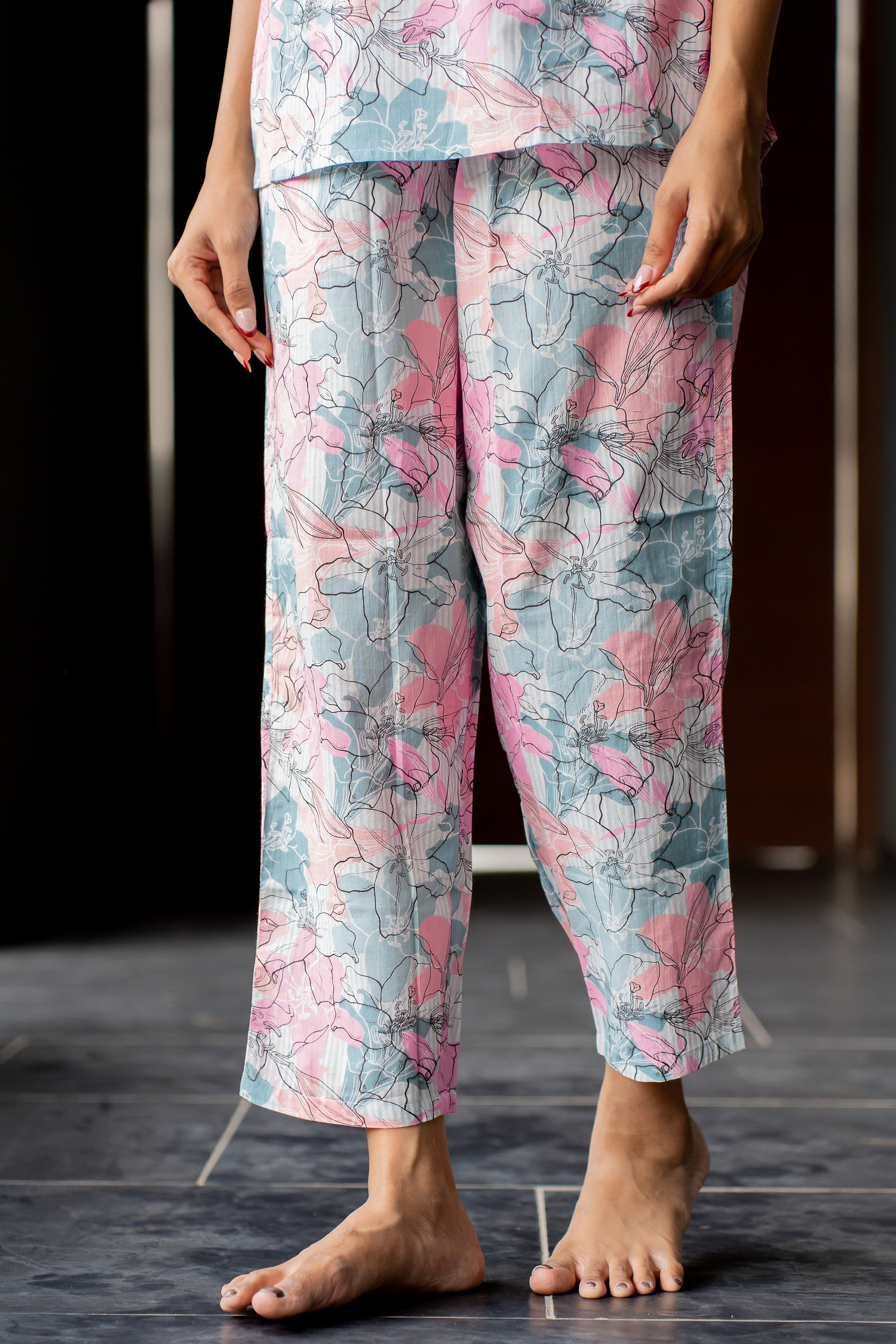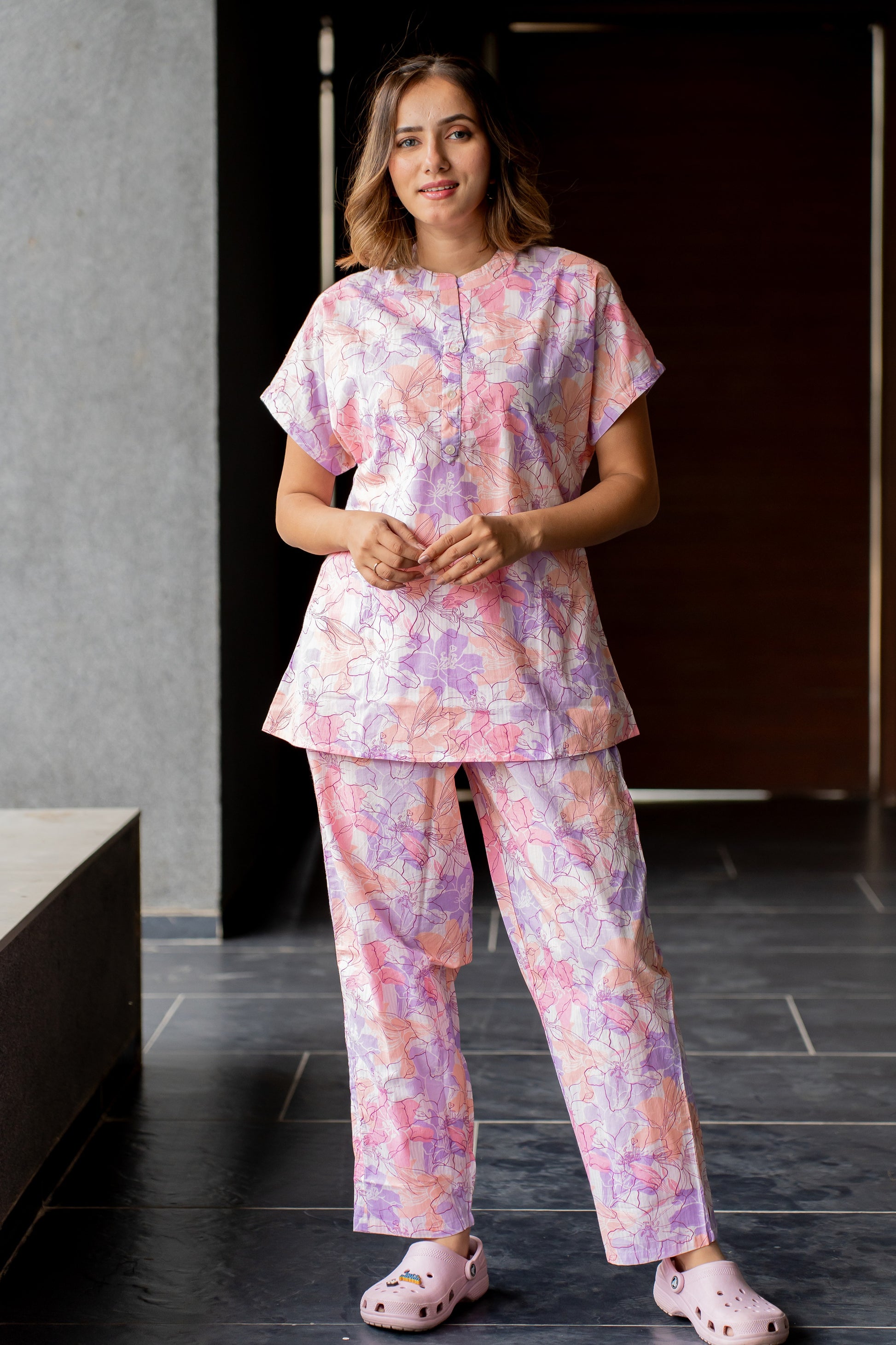 | Experience ultimate comfort with our Elegant Floral printed Lounge Set, perfect for relaxing at home or enjoying a casual day out. This set features a loose-fitting, short-sleeved top with a mandarin collare neck, paired with matching straight-cut pants. The beautiful pastel floral print adds a touch of femininity and style, making it not just sleepwear but a statement in relaxed fashion. Crafted from soft, breathable fabric, this set ensures you stay comfortable and stylish throughout the day. Ideal for all seasons, this lounge set is a must-have addition to your wardrobe. |