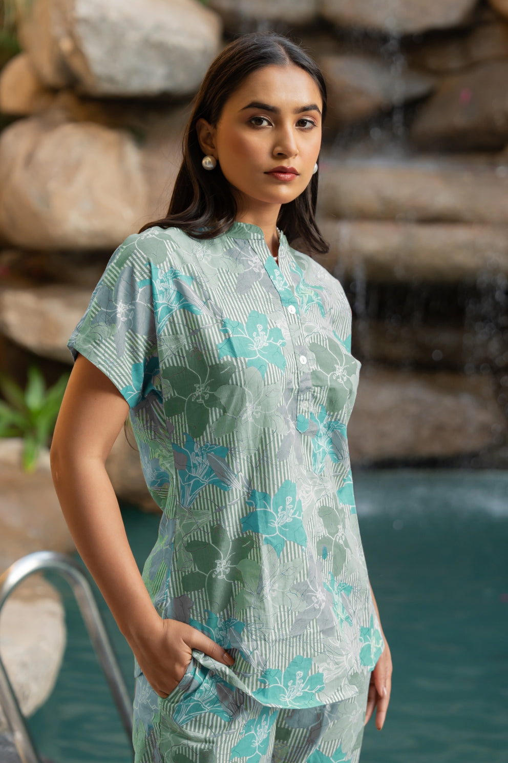 Experience ultimate comfort with our Elegant Floral printed Lounge Set, perfect for relaxing at home or enjoying a casual day out. This set features a loose-fitting, short-sleeved top with a mandarin collare neck, paired with matching straight-cut pants. The beautiful pastel floral print adds a touch of femininity and style, making it not just sleepwear but a statement in relaxed fashion. Crafted from soft, breathable fabric, this set ensures you stay comfortable and stylish throughout the day. Ideal for all seasons, this lounge set is a must-have addition to your wardrobe. |