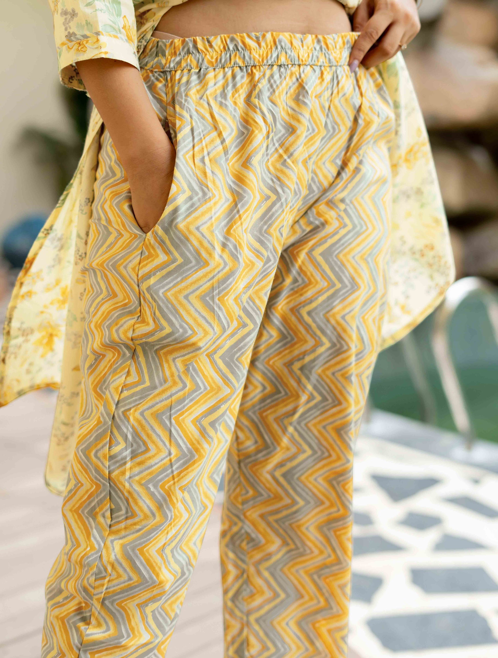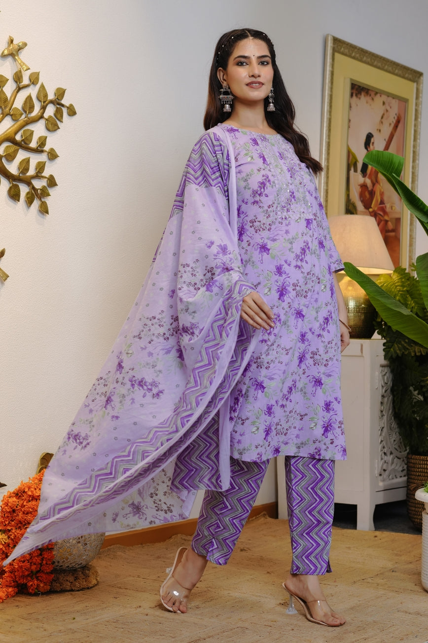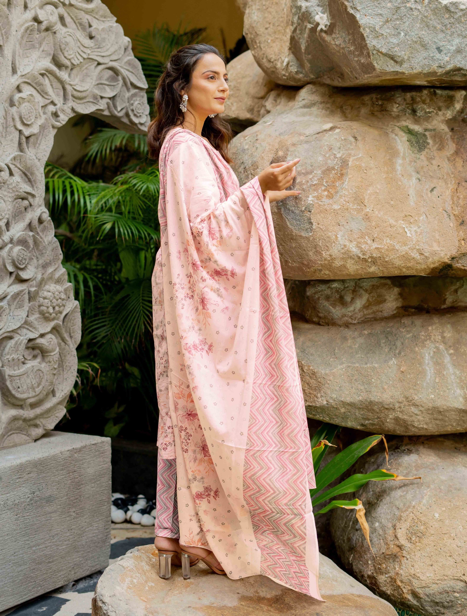| Elevate your everyday style with this Pure Cotton Floral Printed Kurta Set. The soft, pastel kurta, crafted from breathable cotton, features delicate floral patterns enhanced by embroidery detailing on the front, adding a touch of elegance. Paired with zigzag-print pants, this set brings a perfect blend of tradition and contemporary fashion. The matching dupatta, adorned with subtle floral motifs and chevron borders, completes the look. Ideal for casual outings or intimate gatherings or office wear, this lightweight cotton ensemble offers both comfort and chic style. Step out with confidence in this effortlessly trendy outfit. |