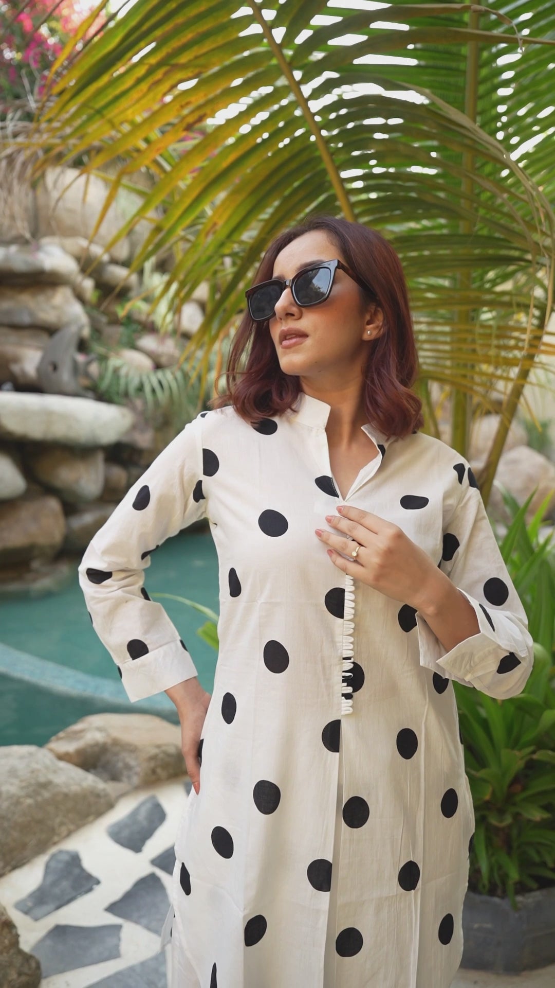 Traditional and elegant polka dots print cotton Co-ord set, featuring a comfortable fit and soft, breathable fabric. The top, featuring a flattering mandarin collar neckline and 3/th sleeves, exudes elegance and comfort. Paired with matching bottoms, this ensemble offers a seamless blend of sophistication and charm. Perfect for any occasion, from casual gatherings to special events.