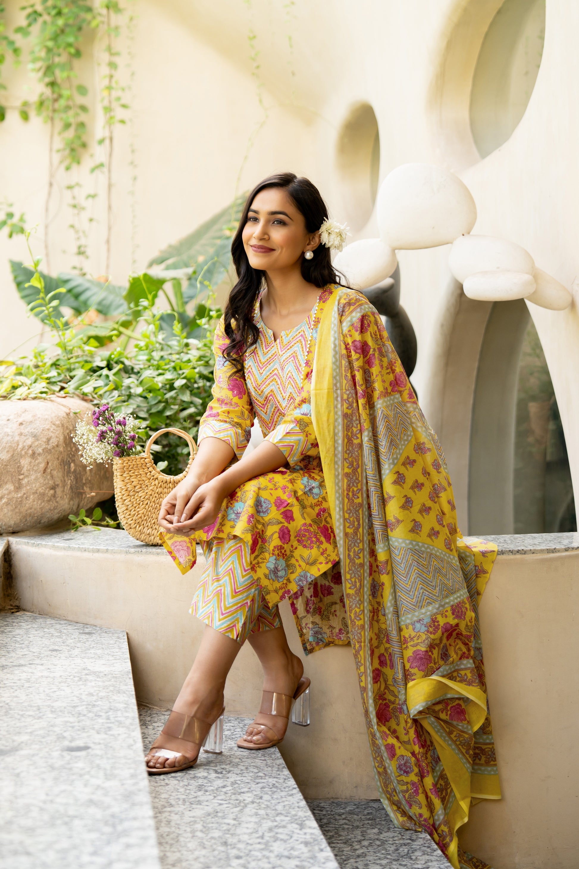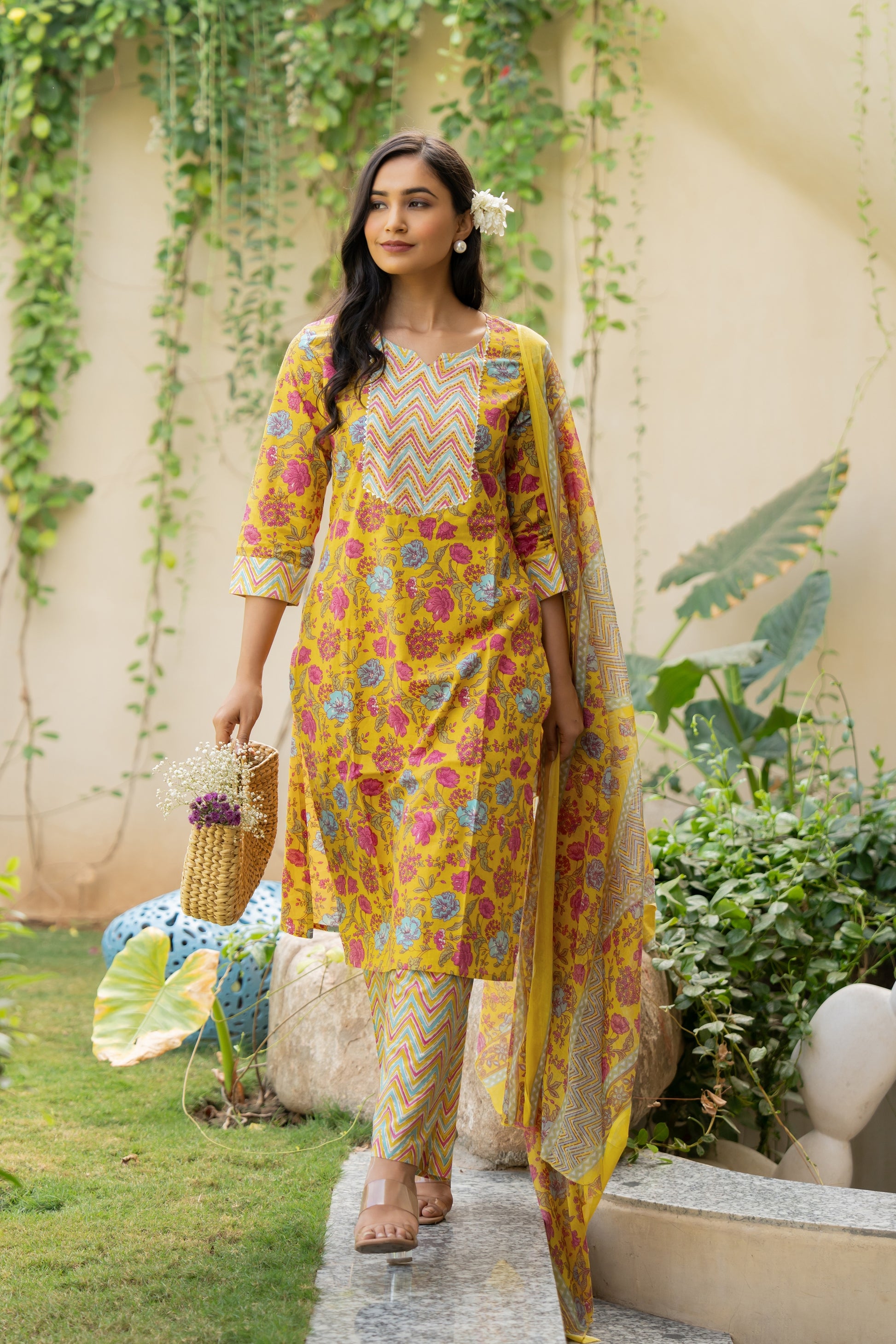 | Elevate your everyday style with this Pure Cotton Floral Printed Kurta Set. The soft, pastel kurta, crafted from breathable cotton, features delicate floral patterns enhanced by sequins thread detailing on the front, adding a touch of elegance. Paired with zigzag-print pants, this set brings a perfect blend of tradition and contemporary fashion. The matching dupatta, adorned with subtle floral motifs and chevron borders, completes the look. Ideal for casual outings or office wear or intimate gatherings, this lightweight cotton ensemble offers both comfort and chic style. Step out with confidence in this effortlessly trendy outfit. |