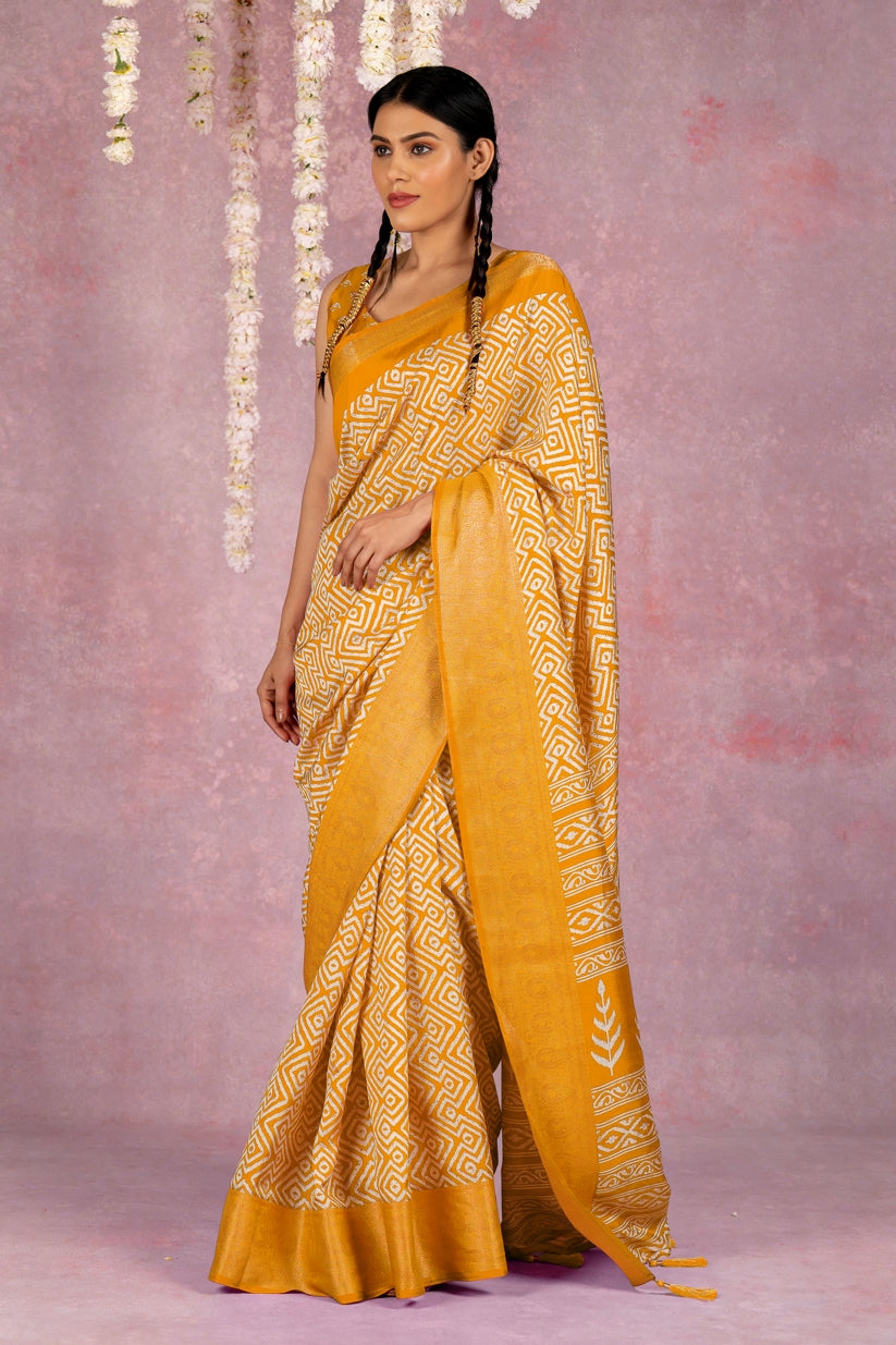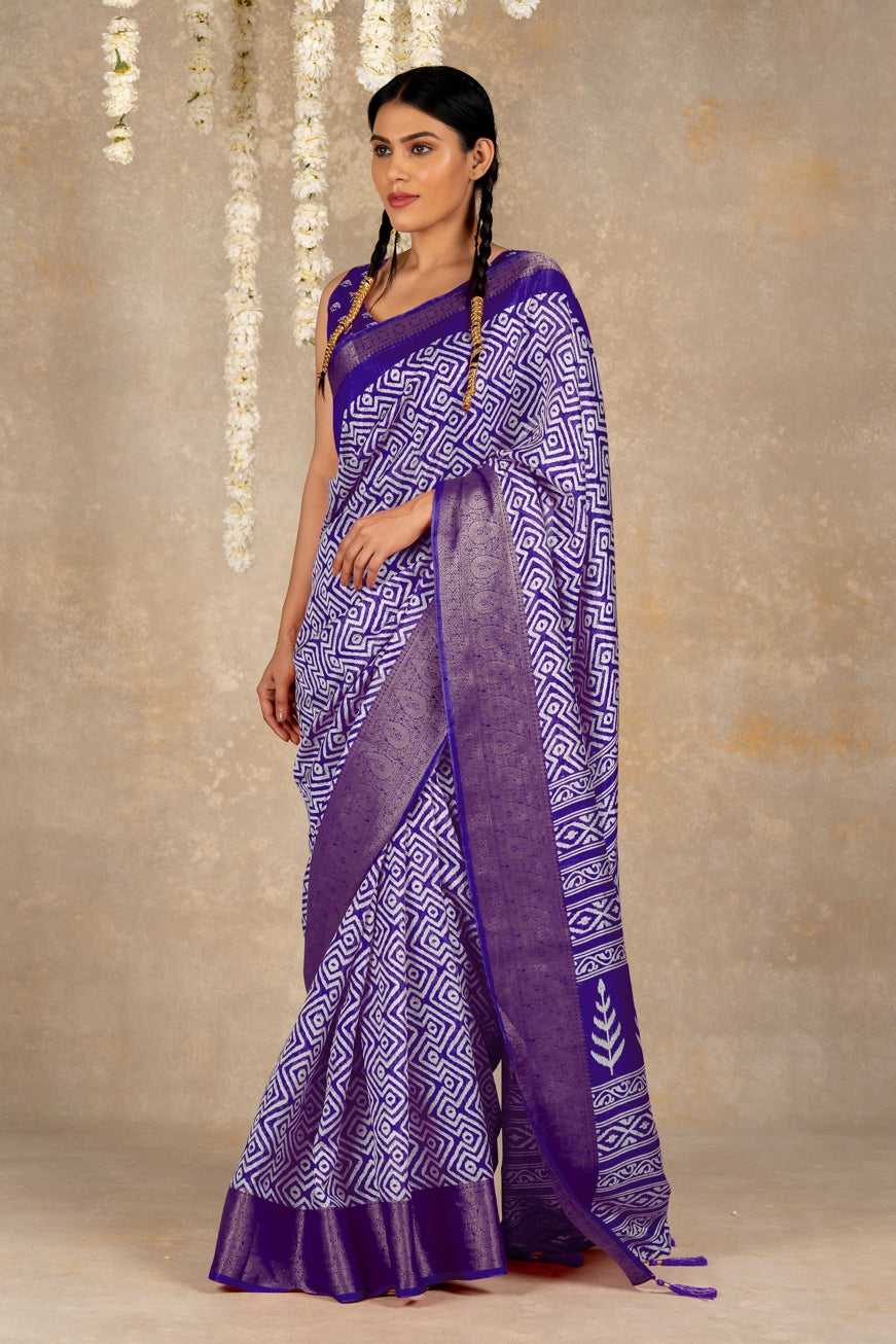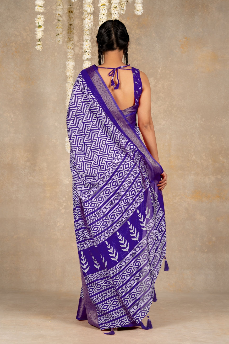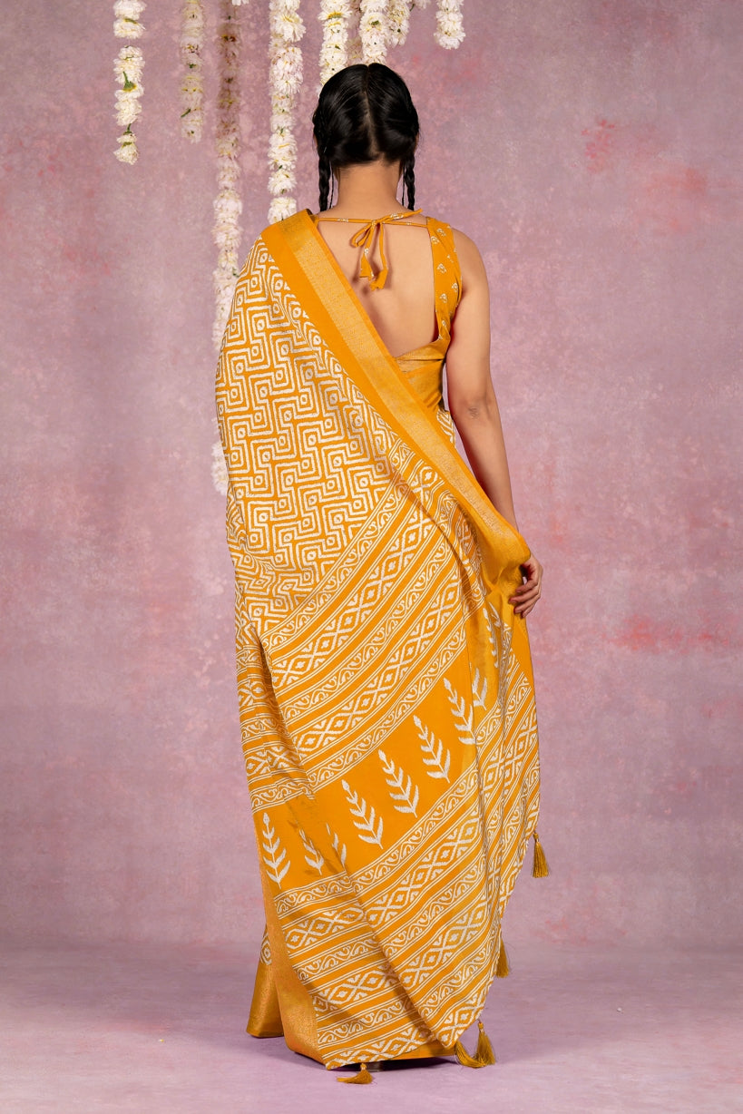 A geometric print saree with golden zari woven border details blends the softness and breeziness of geometric patterns with the intricate artistry of golden zari woven, making it a truly unique and stylish choice. Accompanied by a 0.8-meter blouse piece that can be tailored to your exact size and fit, this saree ensures a custom-made and flawless appearance. This combination of geometric prints and tassels details makes the saree perfect for daytime events like garden parties, brunches, or weddings, where a fresh, light, and sophisticated look is desired.
