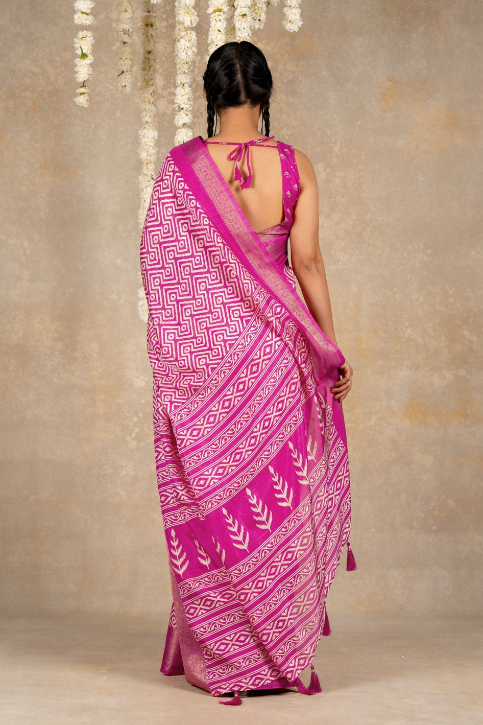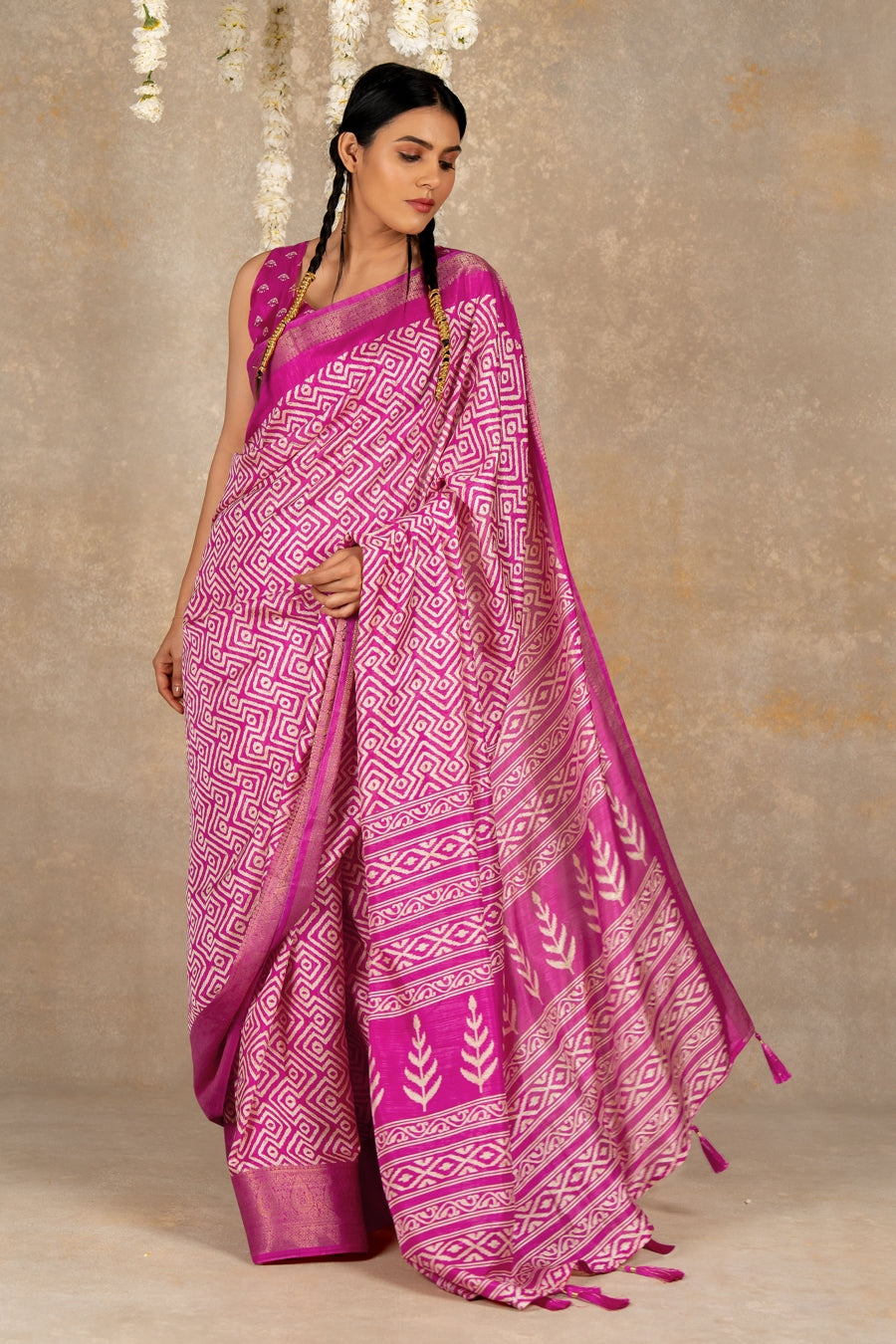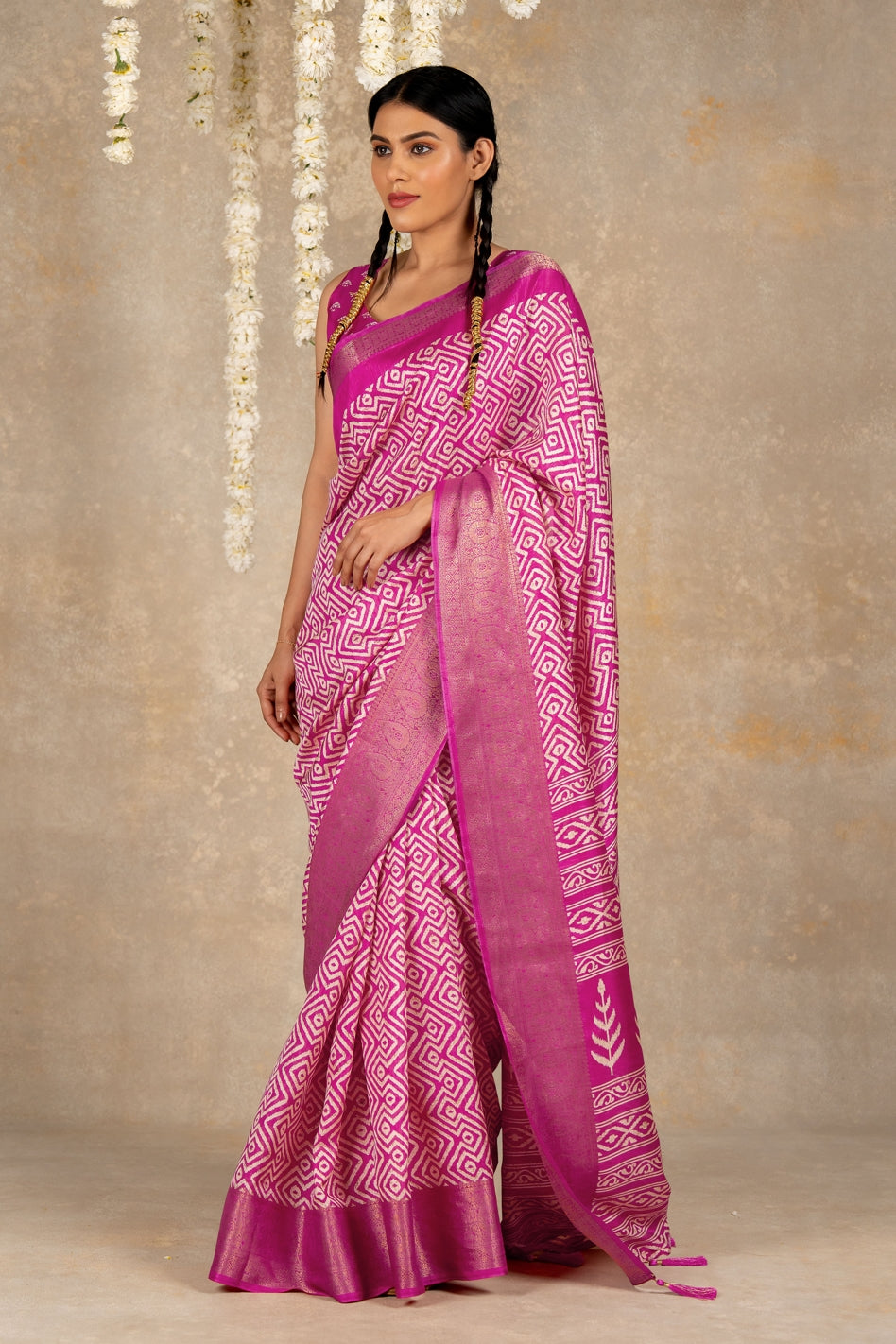 A geometric print saree with golden zari woven border details blends the softness and breeziness of geometric patterns with the intricate artistry of golden zari woven, making it a truly unique and stylish choice. Accompanied by a 0.8-meter blouse piece that can be tailored to your exact size and fit, this saree ensures a custom-made and flawless appearance. This combination of geometric prints and tassels details makes the saree perfect for daytime events like garden parties, brunches, or weddings, where a fresh, light, and sophisticated look is desired.