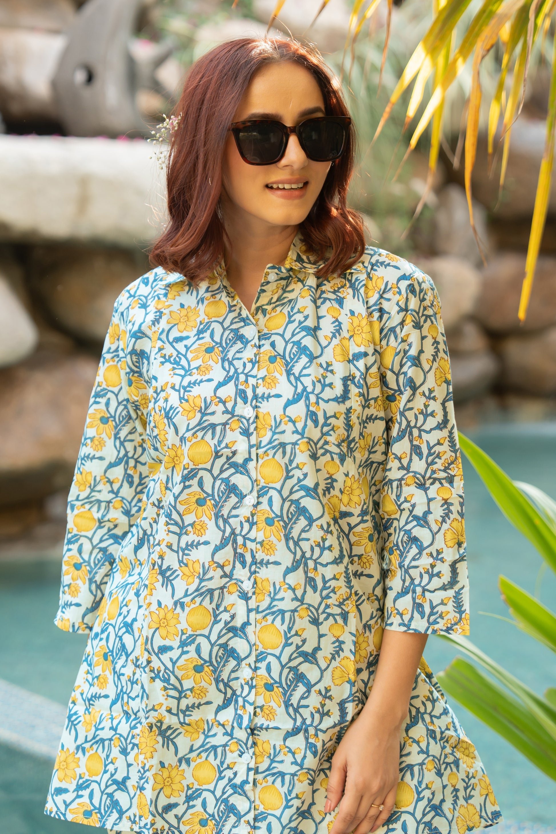 Traditional and elegant floral print cotton Co-ord set, featuring a comfortable fit and soft, breathable fabric. The top, featuring a flattering mandarin collar neckline and 3/th sleeves, exudes elegance and comfort. Paired with matching bottoms, this ensemble offers a seamless blend of sophistication and charm. Perfect for any occasion, from casual gatherings to special events.