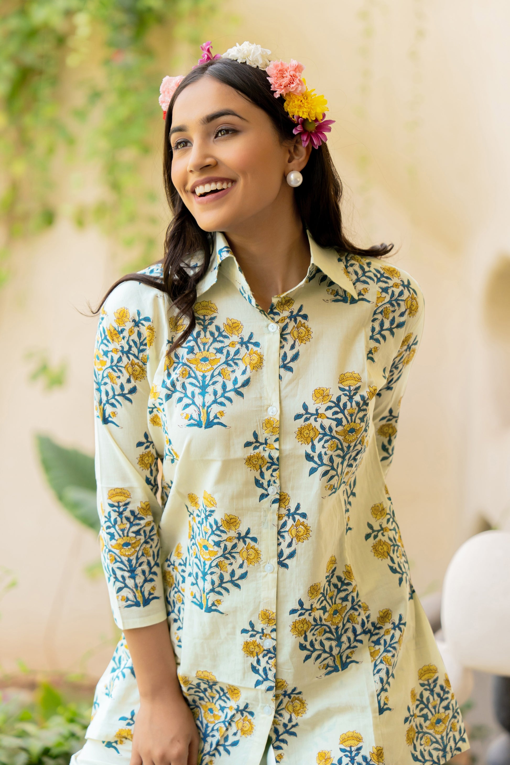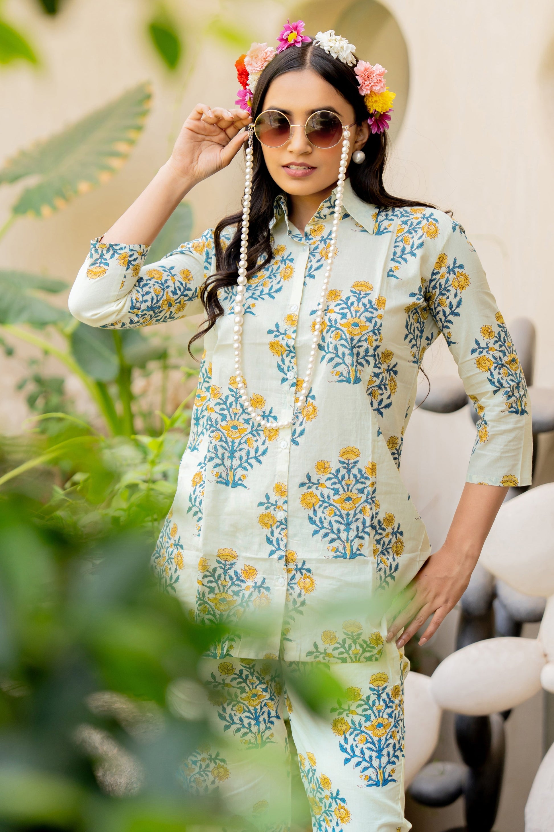 Traditional and elegant floral print cotton Co-ord set, featuring a comfortable fit and soft, breathable fabric. The top, featuring a flattering mandarin collar neckline and 3/th sleeves, exudes elegance and comfort. Paired with matching bottoms, this ensemble offers a seamless blend of sophistication and charm. Perfect for any occasion, from casual gatherings to special events.