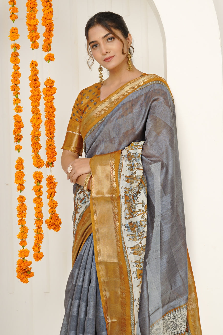A madhubani print saree with golden zari woven border details blends the softness and breeziness of madhubani patterns with the intricate artistry of golden zari woven border, making it a truly unique and stylish choice. Accompanied by a 0.8-meter blouse piece that can be tailored to your exact size and fit, this saree ensures a custom-made and flawless appearance. This combination of madhubani prints and tassels details makes the saree perfect for daytime events like garden parties, brunches, or weddings, where a fresh, light, and sophisticated look is desired.