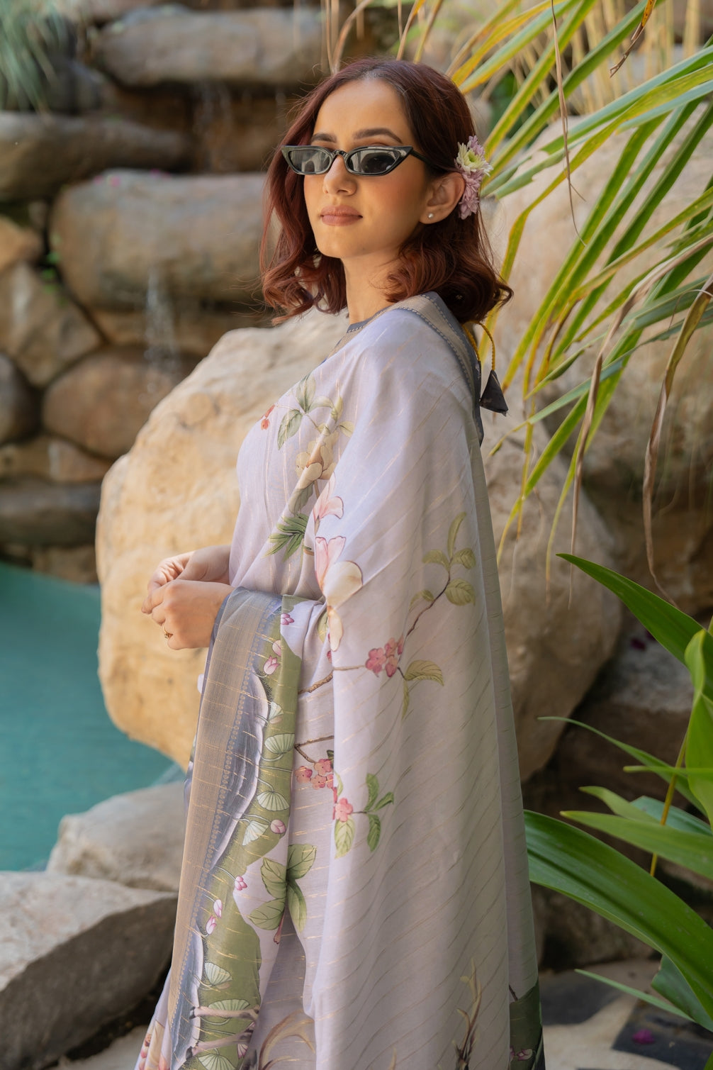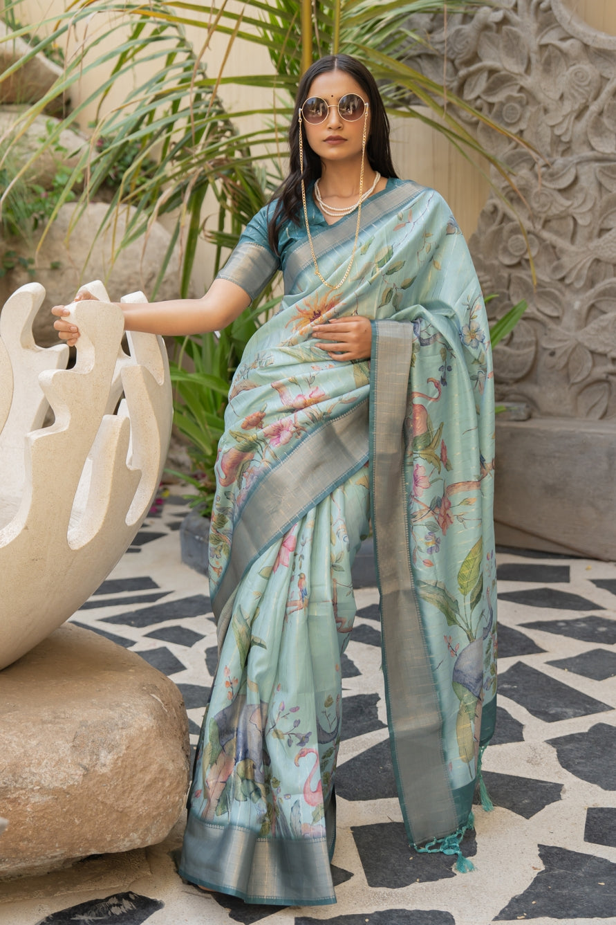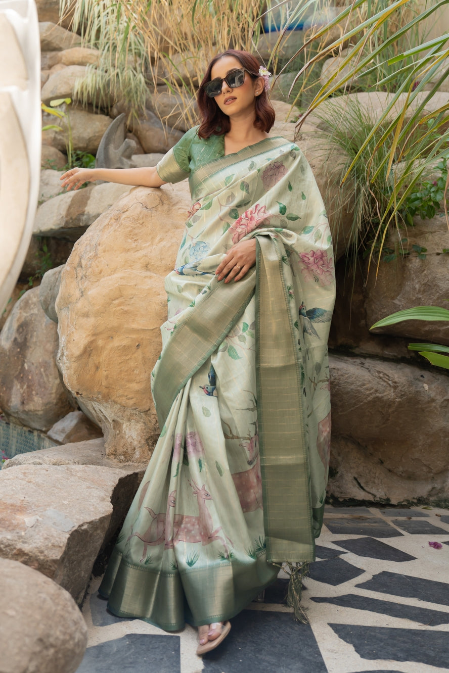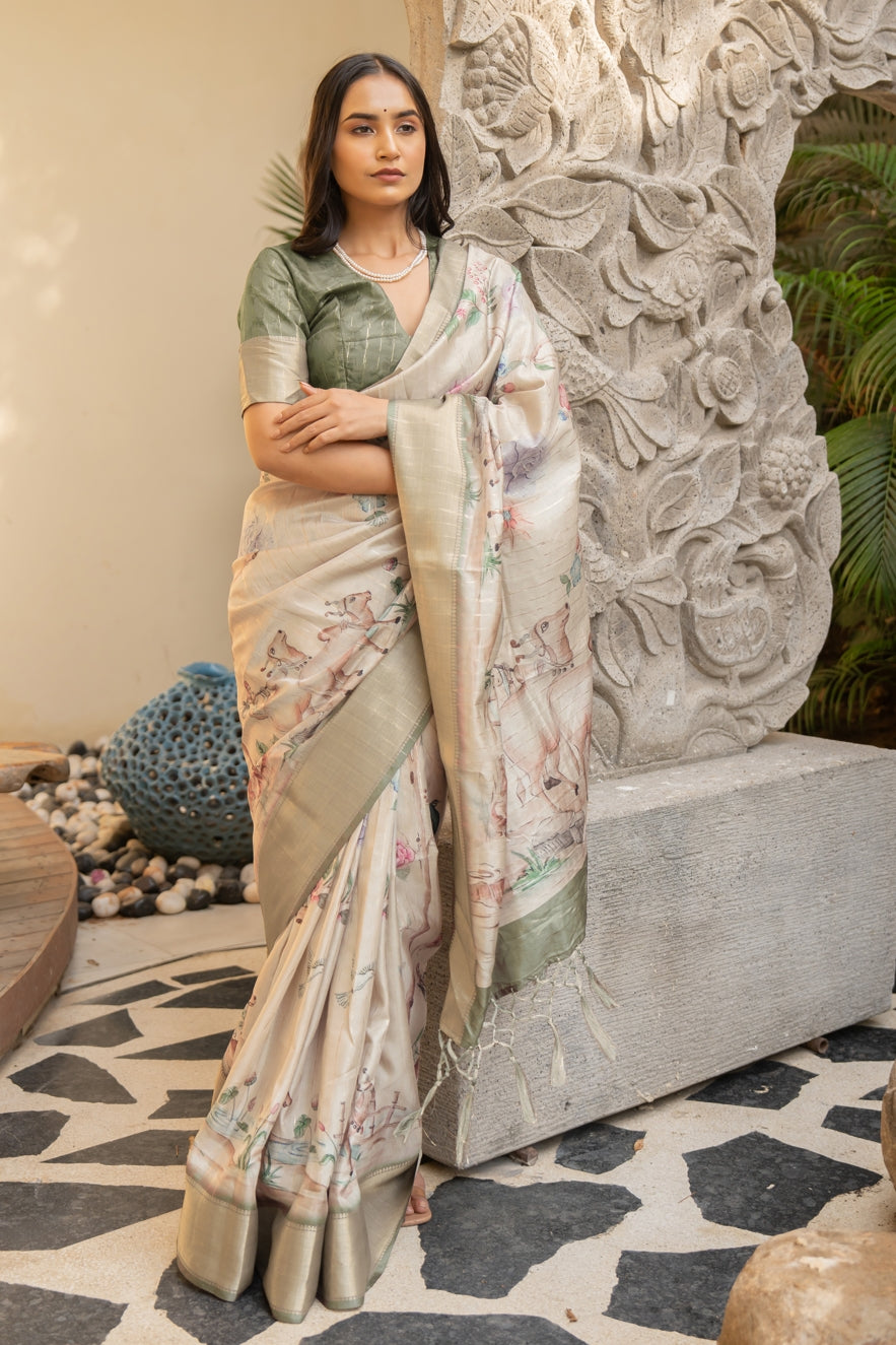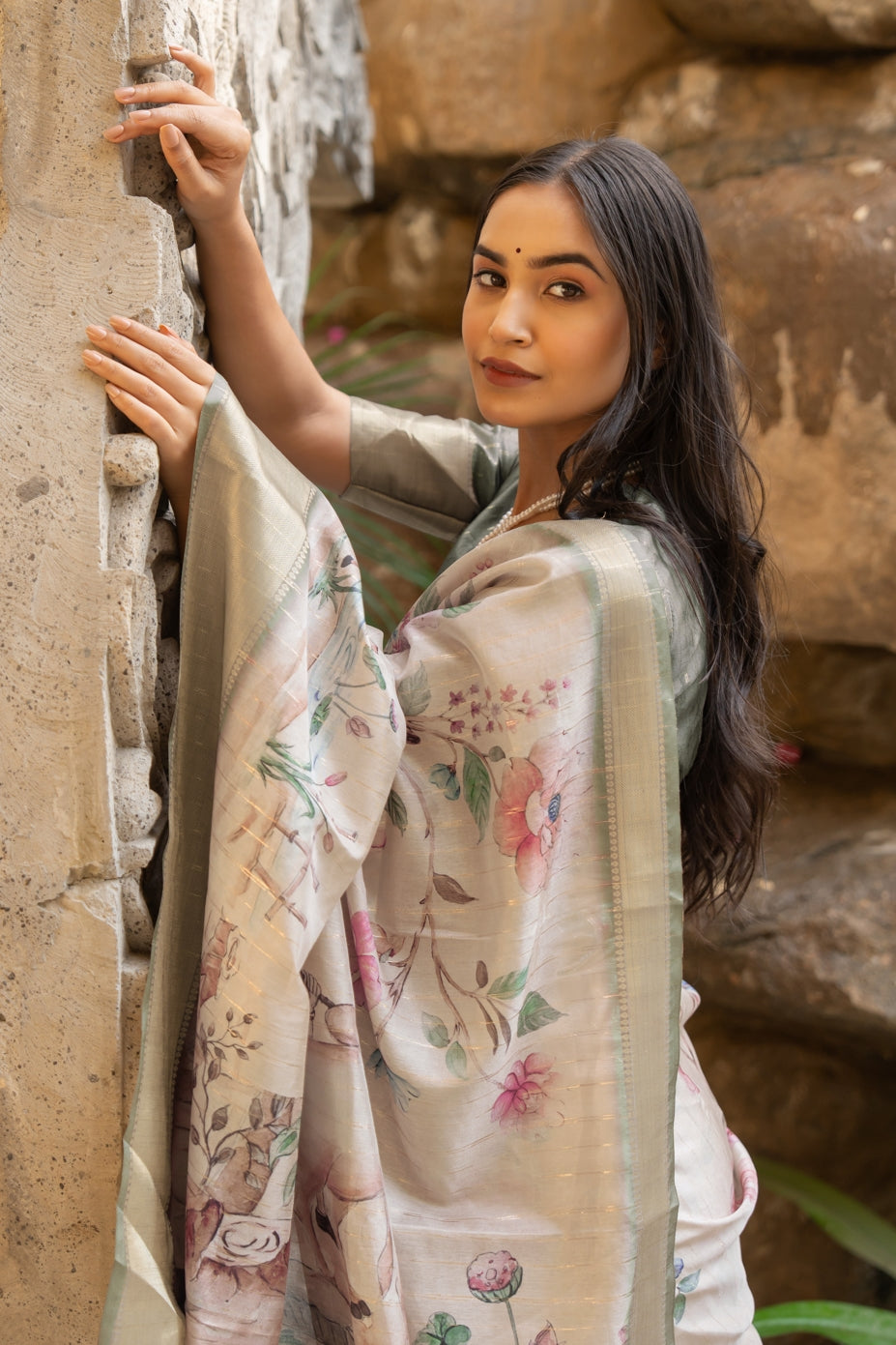 A floral and animal print saree with golden zari woven details blends the softness and breeziness of floral patterns with the intricate artistry of golden zari woven, making it a truly unique and stylish choice. Accompanied by a 0.8-meter blouse piece that can be tailored to your exact size and fit, this saree ensures a custom-made and flawless appearance. This combination of animal prints and tassels details makes the saree perfect for daytime events like garden parties, brunches, or weddings, where a fresh, light, and sophisticated look is desired.