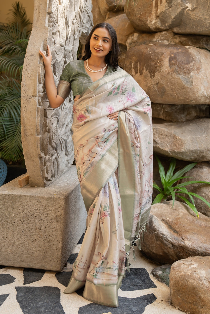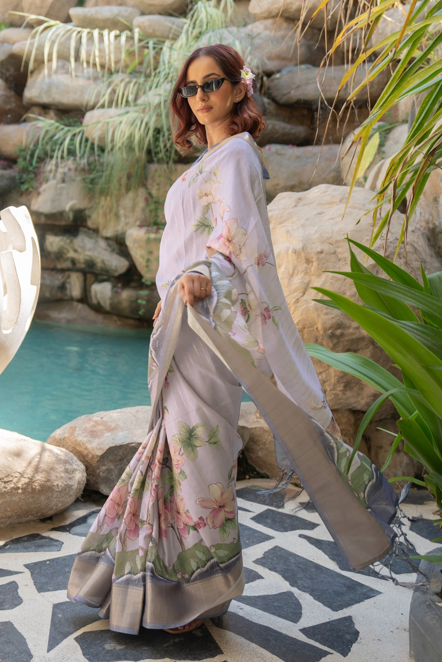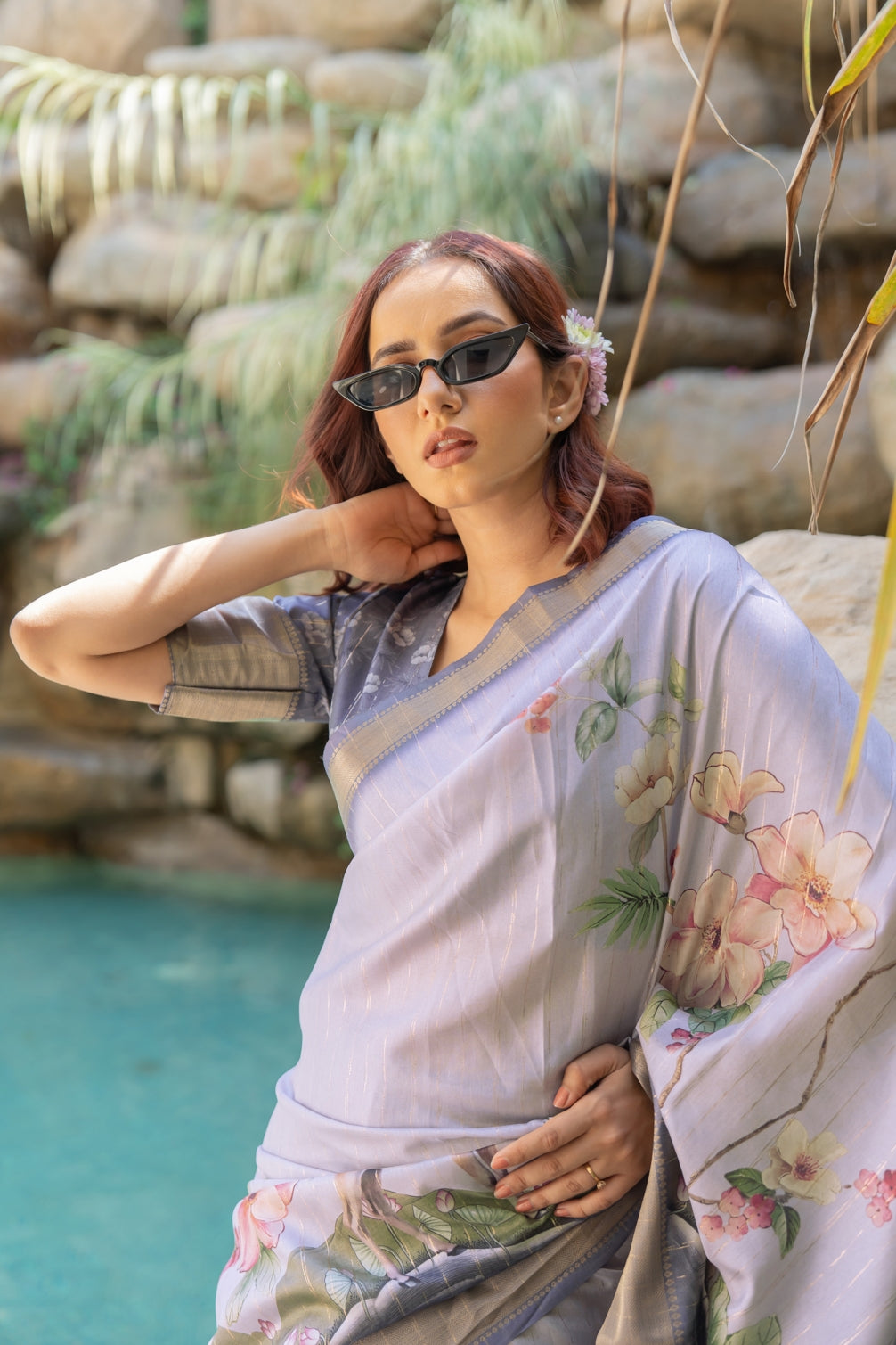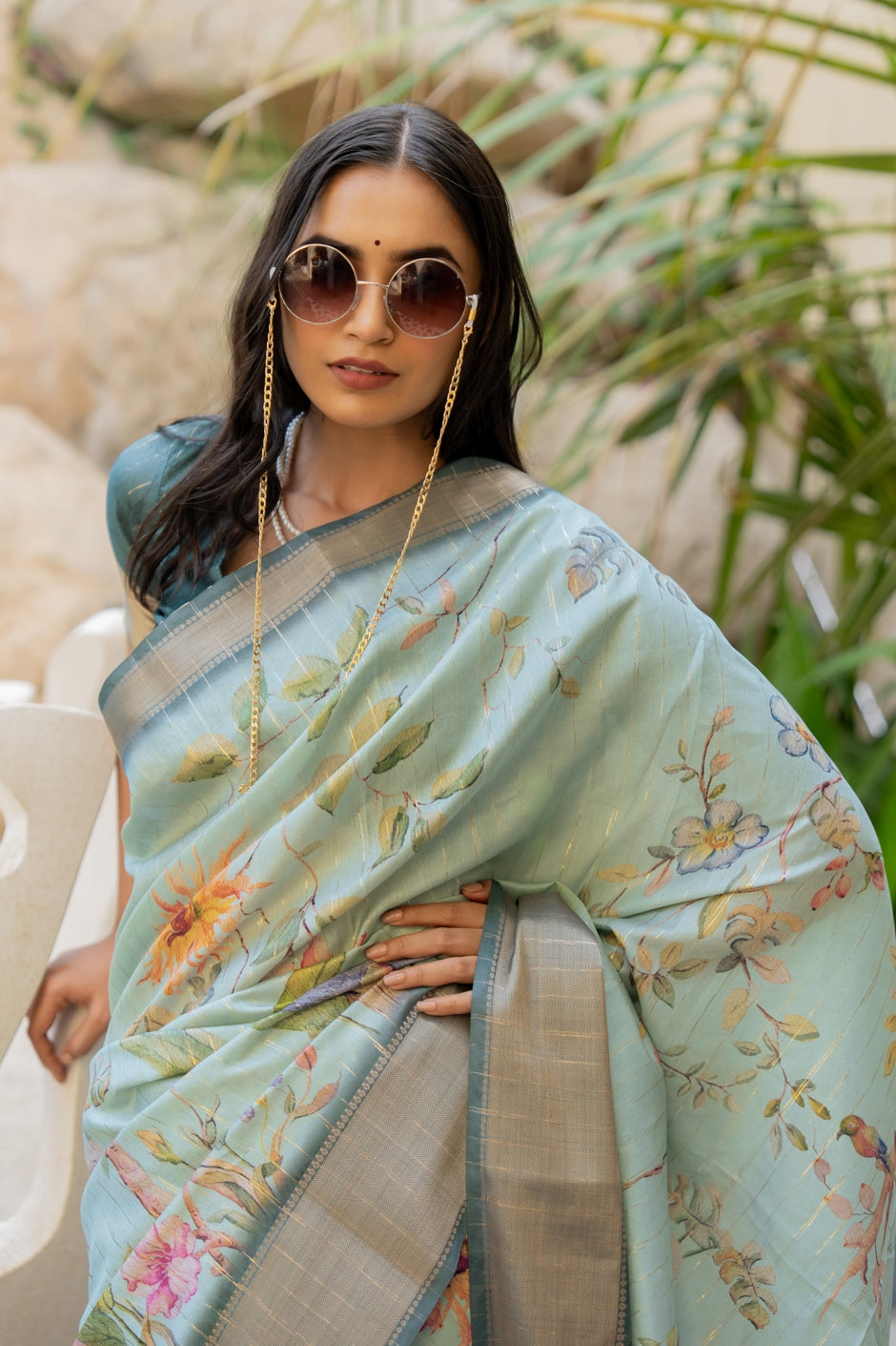 Latest Silk Blend,Cotton Silk Floral Print Saree With Unstitched Blouse