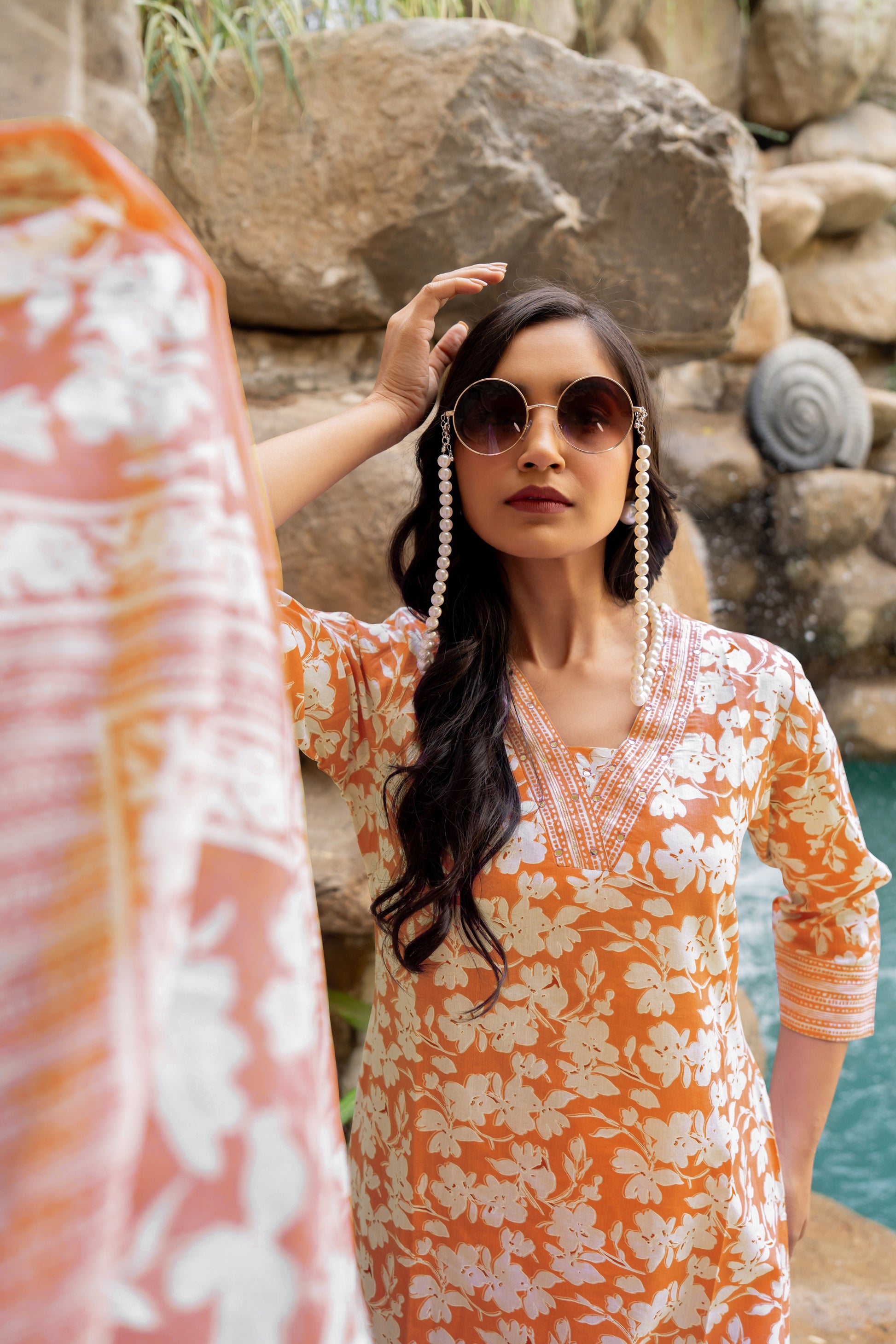 Elevate your everyday style with this Pure Cotton Paisley Printed Kurta Set. The soft, pastel kurta, crafted from breathable cotton, features delicate floral patterns enhanced by plastic mirror and sequins detailing on the front, adding a touch of elegance. Paired with batik-print pants, this set brings a perfect blend of tradition and contemporary fashion. The matching dupatta, adorned with subtle floral motifs, completes the look. Ideal for casual outings or office wear or intimate gatherings, this lightweight cotton ensemble offers both comfort and chic style. Step out with confidence in this effortlessly trendy outfit.
