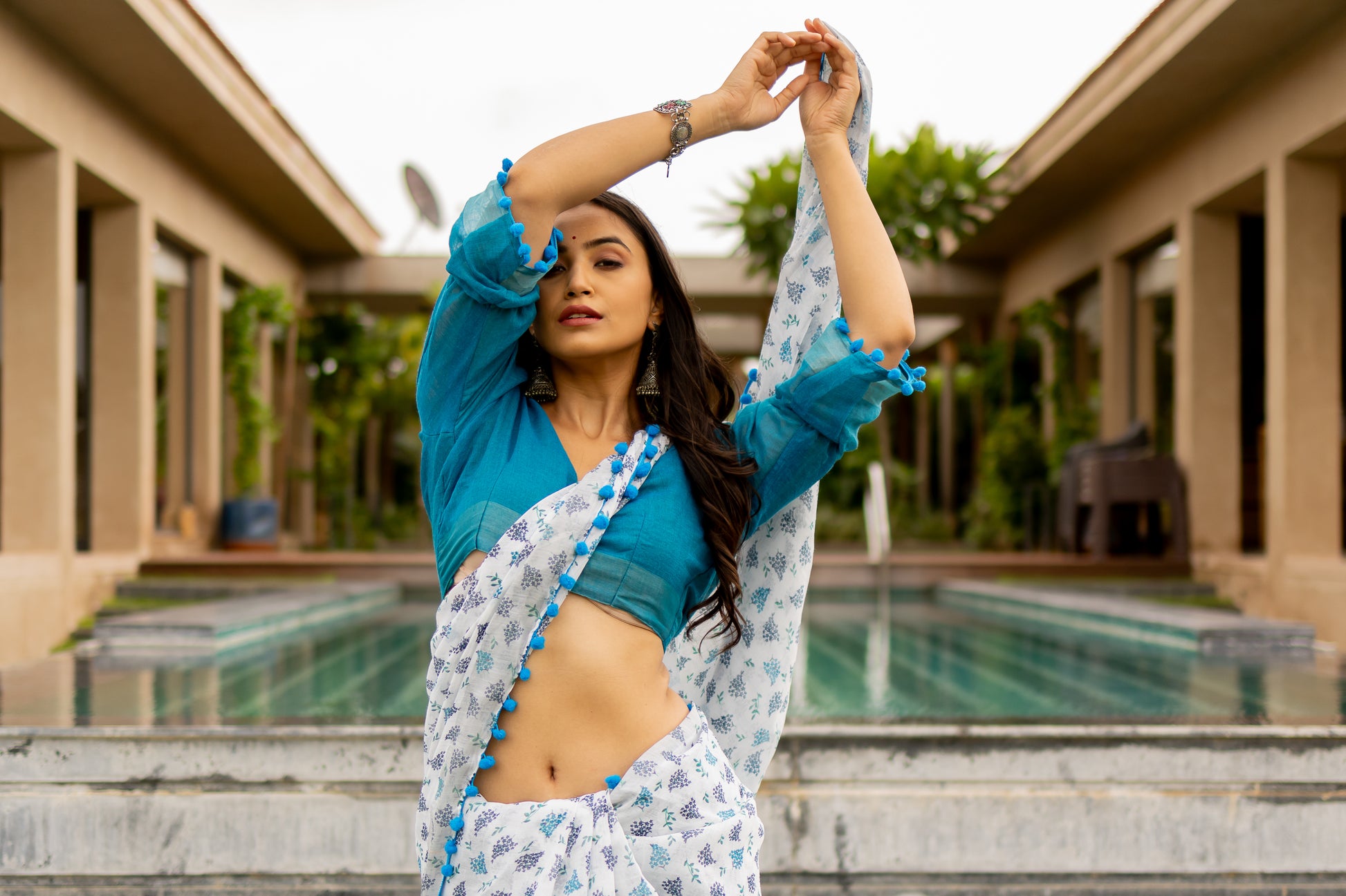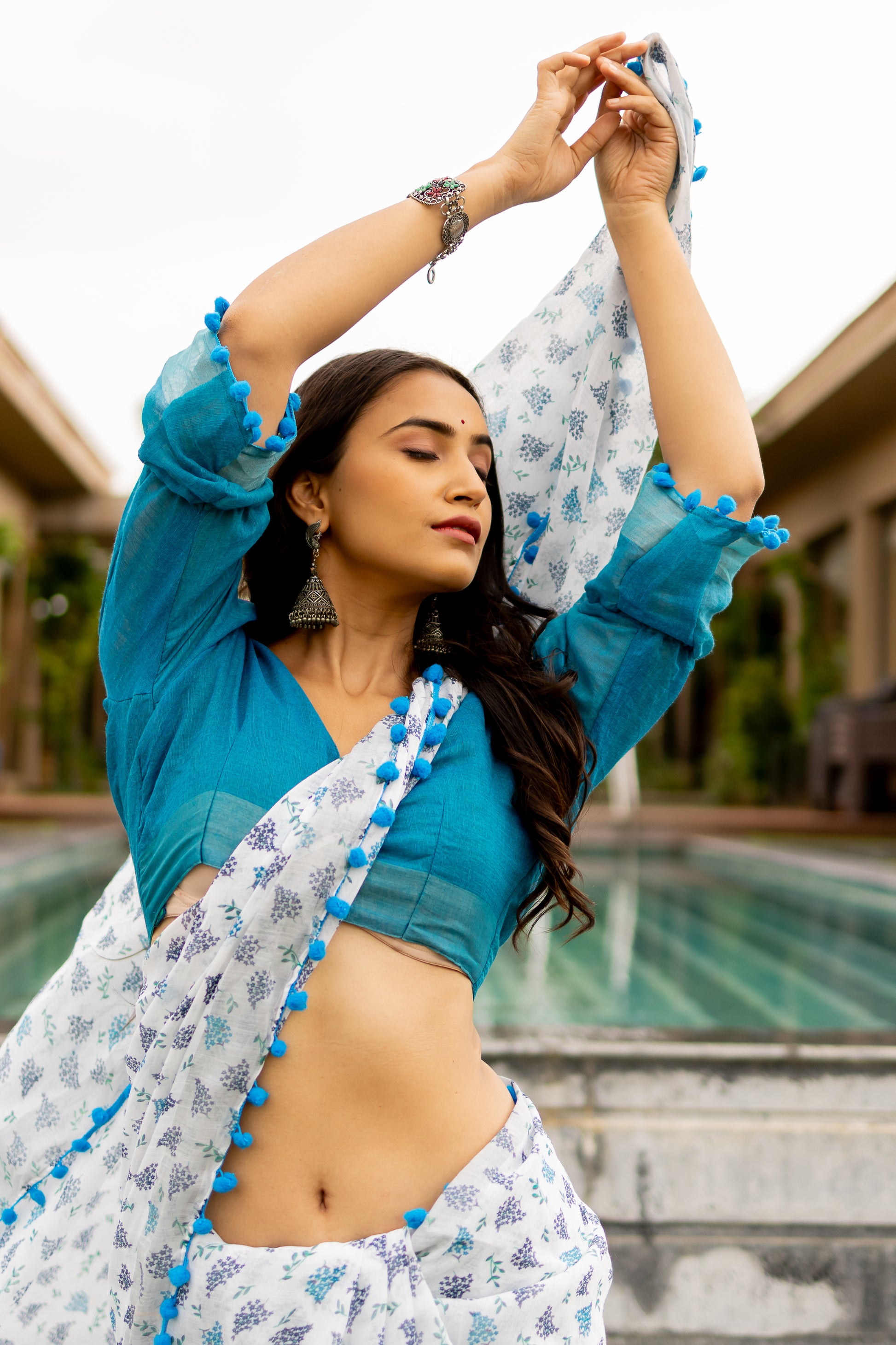 cotton saree adorned with a delightful floral print and playful pom pom lace border. This is traditional aesthetics with contemporary flair, making it a perfect choice for casual gatherings or festive celebrations. Crafted from soft, breathable cotton, it ensures comfort throughout the day. The enchanting floral patterns bring a fresh and lively feel, while the whimsical pom pom lace border adds a fun twist to your ensemble. Easy to drape and style, this saree pairs beautifully with a variety of blouses. Embrace your inner diva and make a statement with this unique piece!