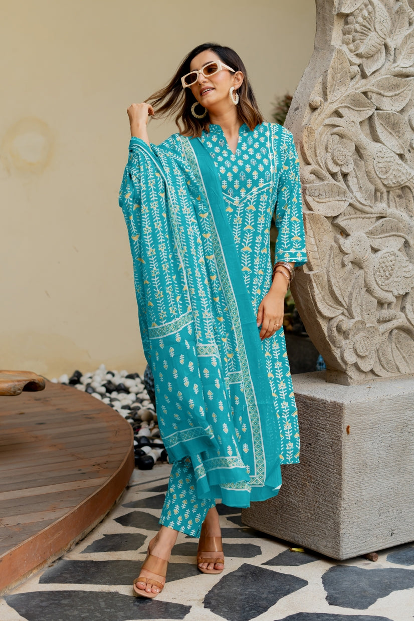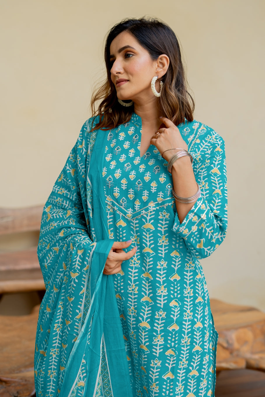 Elevate your everyday style with this Pure Cotton Batik Floral Printed Kurta Set. The soft, pastel kurta, crafted from breathable cotton, features delicate floral patterns enhanced by mirror embroidery detailing on the front, adding a touch of elegance. Paired with batik print pants, this set brings a perfect blend of tradition and contemporary fashion. The matching dupatta, adorned with subtle batik floral motifs, completes the look. Ideal for casual outings or office wear or intimate gatherings, this lightweight cotton ensemble offers both comfort and chic style. Step out with confidence in this effortlessly trendy outfit.