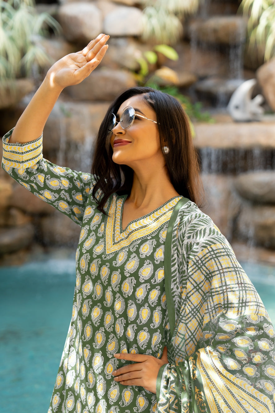 | Elevate your everyday style with this Pure Cotton Paisley Printed Kurta Set. The soft, pastel kurta, crafted from breathable cotton, features delicate floral patterns enhanced by sequins detailing on the front, adding a touch of elegance. Paired with zigzag-print pants, this set brings a perfect blend of tradition and contemporary fashion. The matching dupatta, adorned with subtle paisley motifs and zig zag borders, completes the look. Ideal for casual outings or office wear or intimate gatherings, this lightweight cotton ensemble offers both comfort and chic style. Step out with confidence in this effortlessly trendy outfit. |