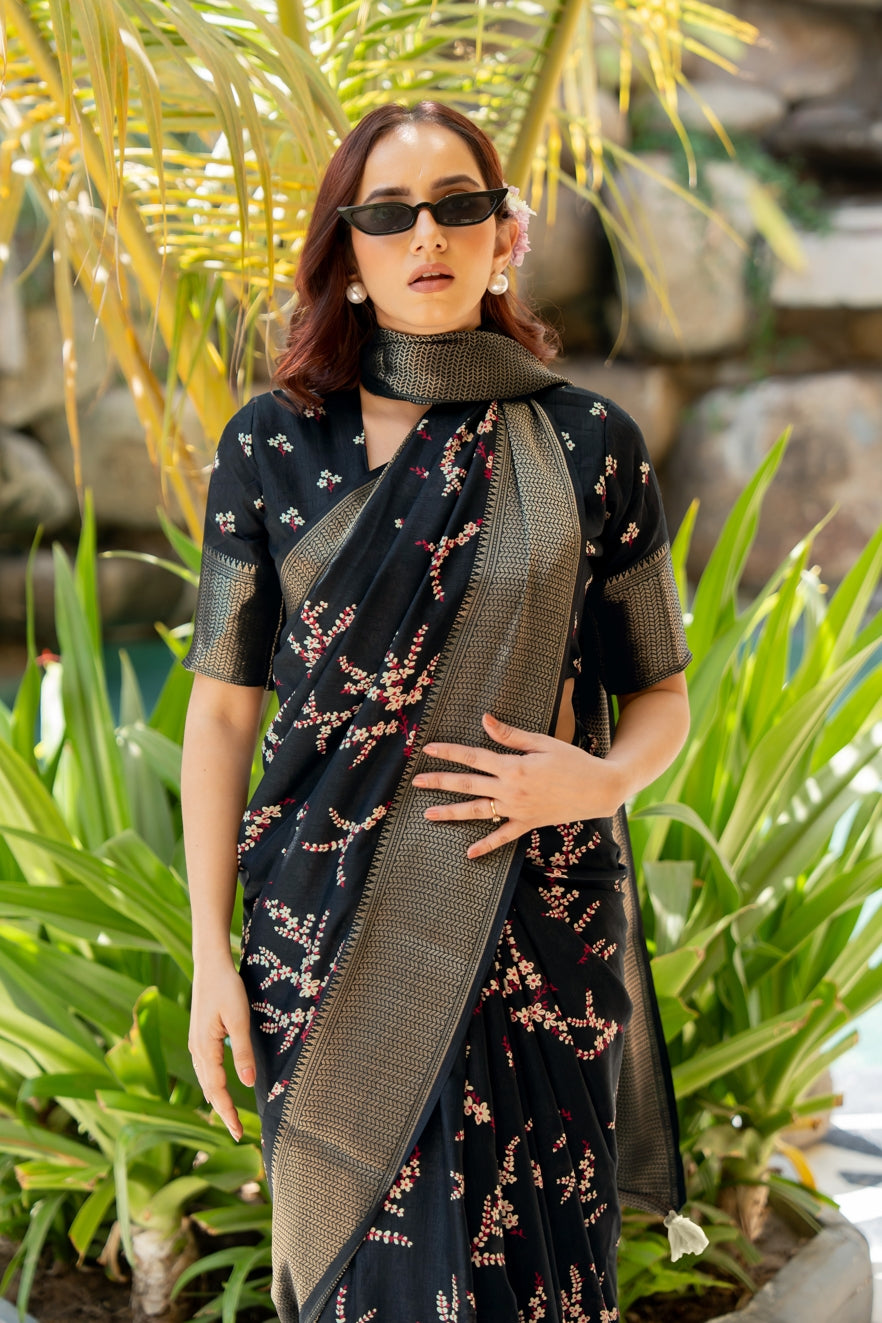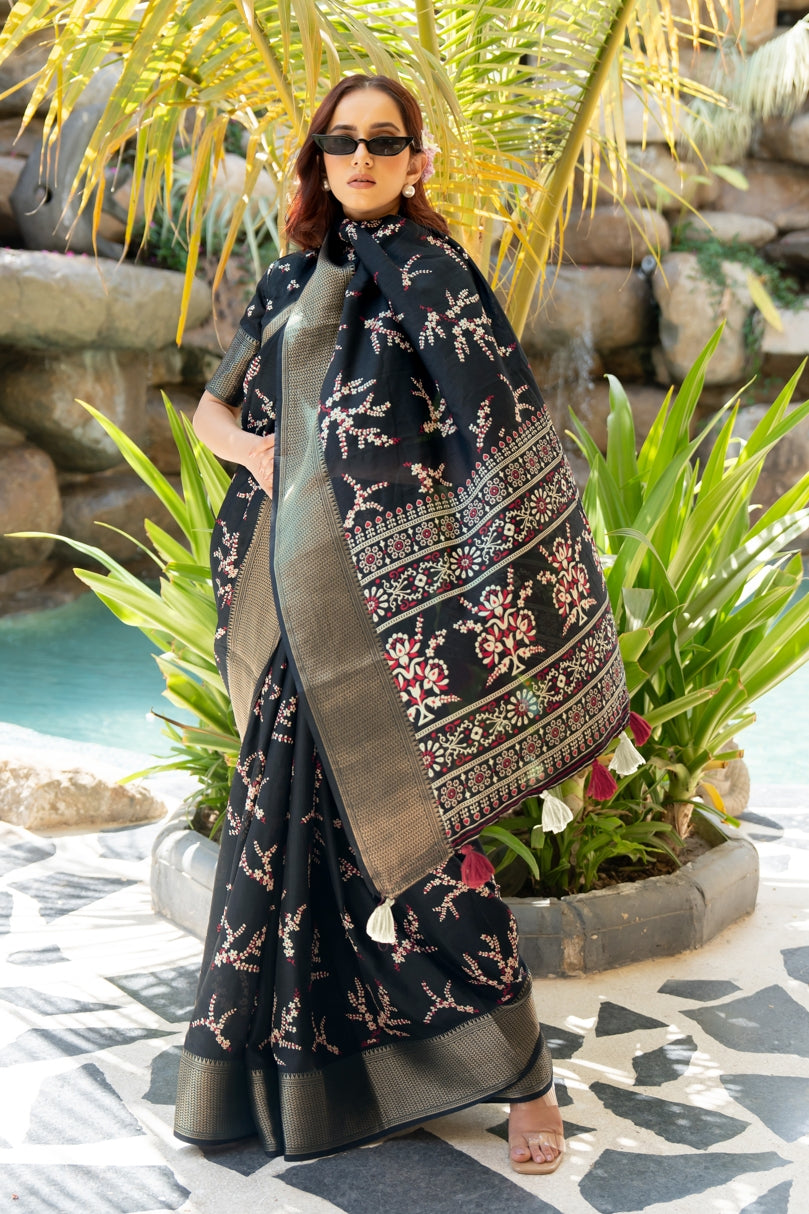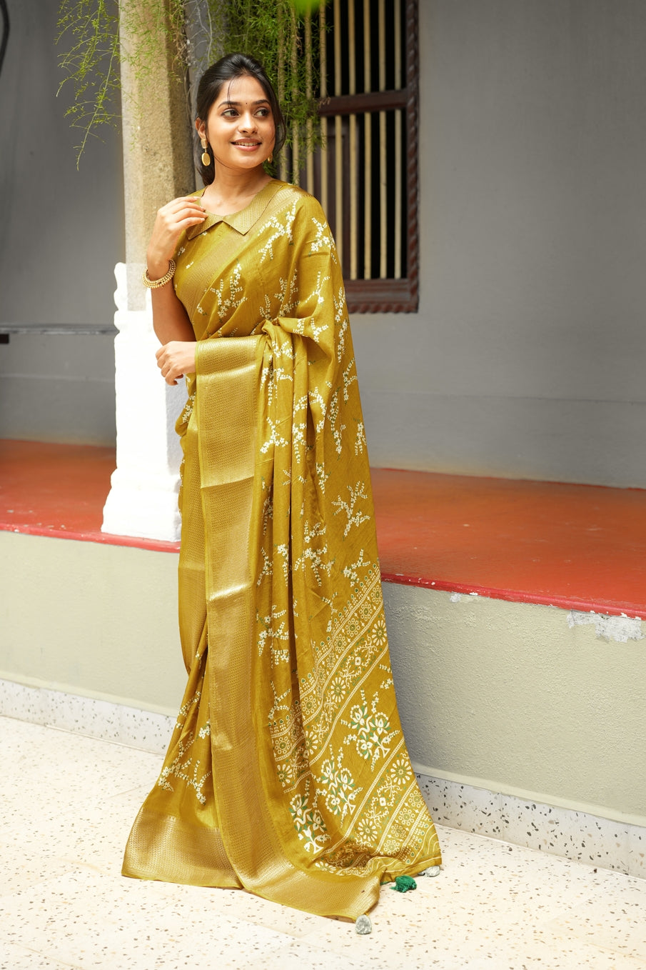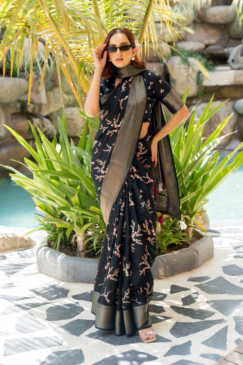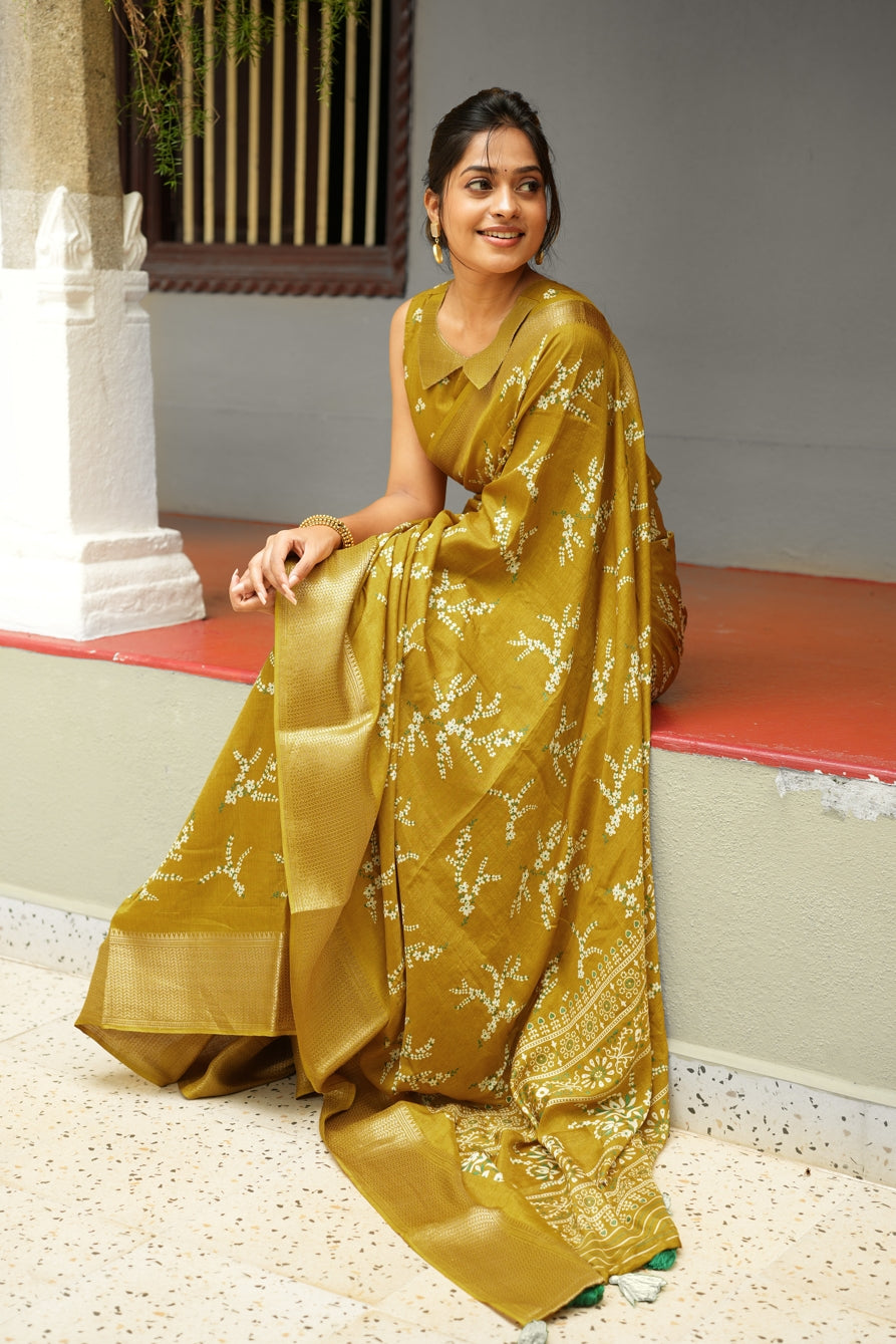A floral print saree with golden zari woven border details blends the softness and breeziness of floral patterns with the intricate artistry of golden zari woven, making it a truly unique and stylish choice. Accompanied by a 0.8-meter blouse piece that can be tailored to your exact size and fit, this saree ensures a custom-made and flawless appearance. This combination of floral prints and tassels details makes the saree perfect for daytime events like garden parties, brunches, or weddings, where a fresh, light, and sophisticated look is desired.