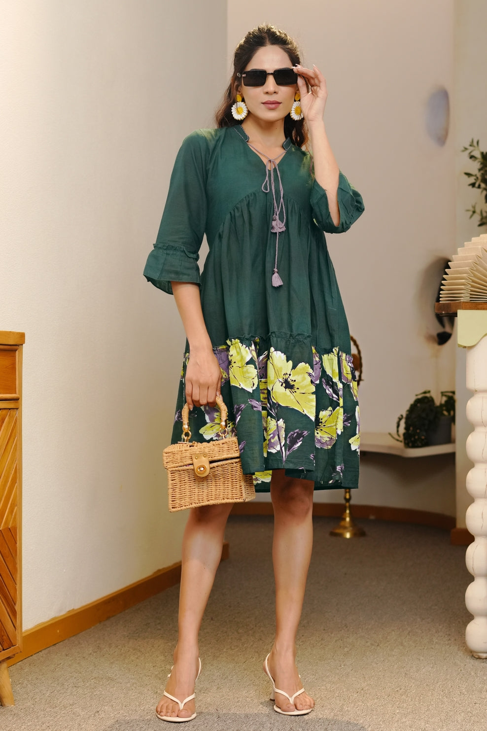 Trendy Floral Print Cotton Dress