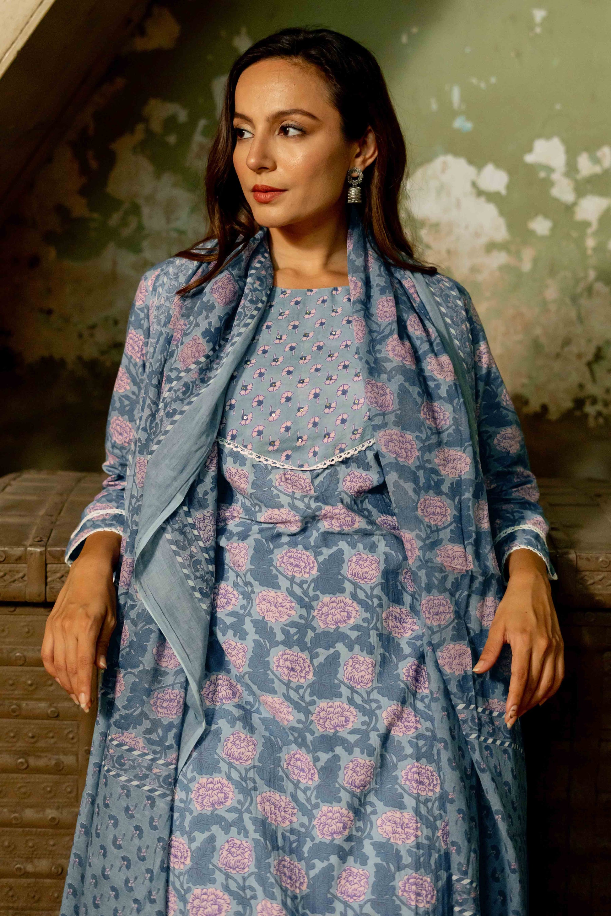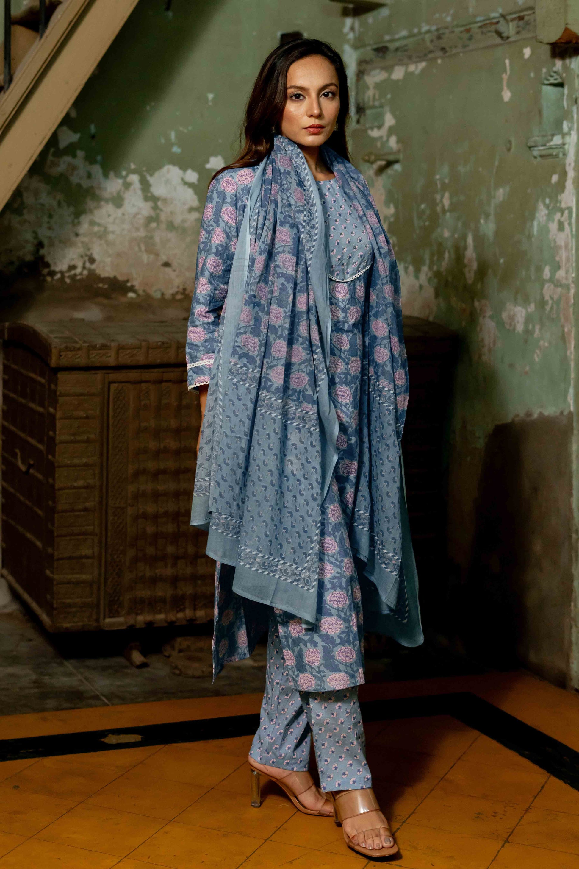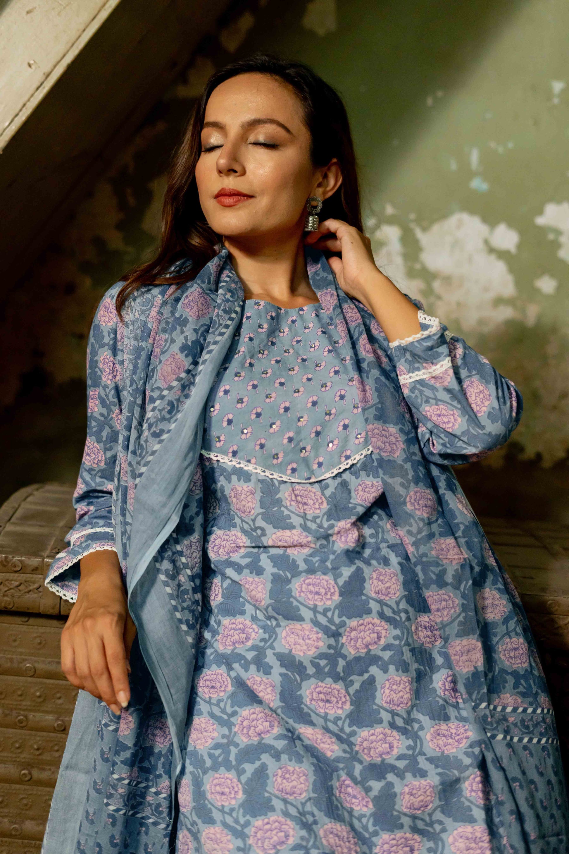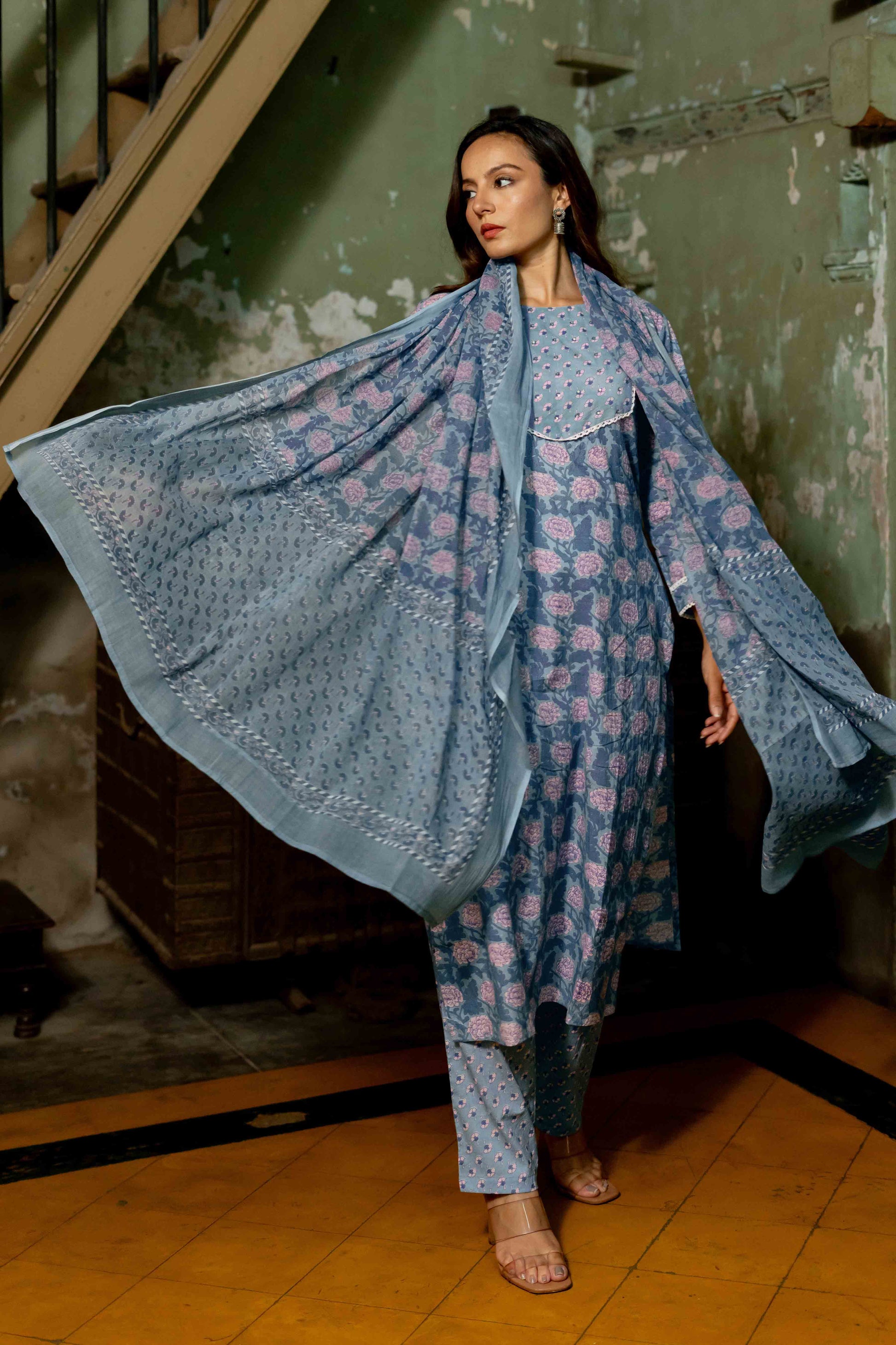 Embrace the purity of comfort with our elegantly designed kurta set, crafted from pure cotton fabric. The intricate floral prints with sequins and crochet lace touch highlight timeless artistry, while the matching dupatta adds a touch of tradition. Perfect for any occasion, from daily casual wear to office wear or small social gatherings this ensemble offers both elegance and breathable comfort, making it an essential addition to your ethnic wardrobe.