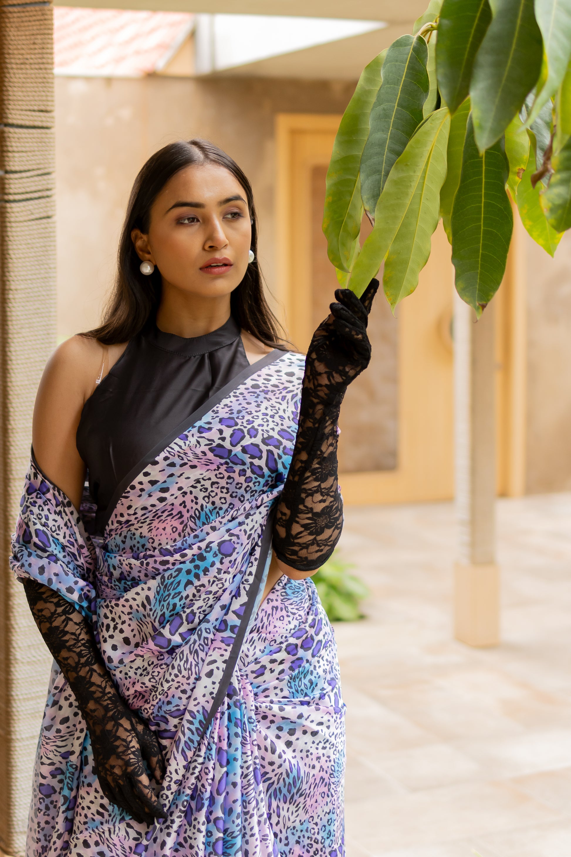 This elegant satin georgette saree features a vibrant blend of blue and purple hues, adorned with an intricate animal print that adds to its exquisite charm. The lustrous sheen of the fabric enhances the overall appeal, making it suitable for both formal occasions and festive celebrations. Paired with black gloves, this saree exudes sophistication and style.