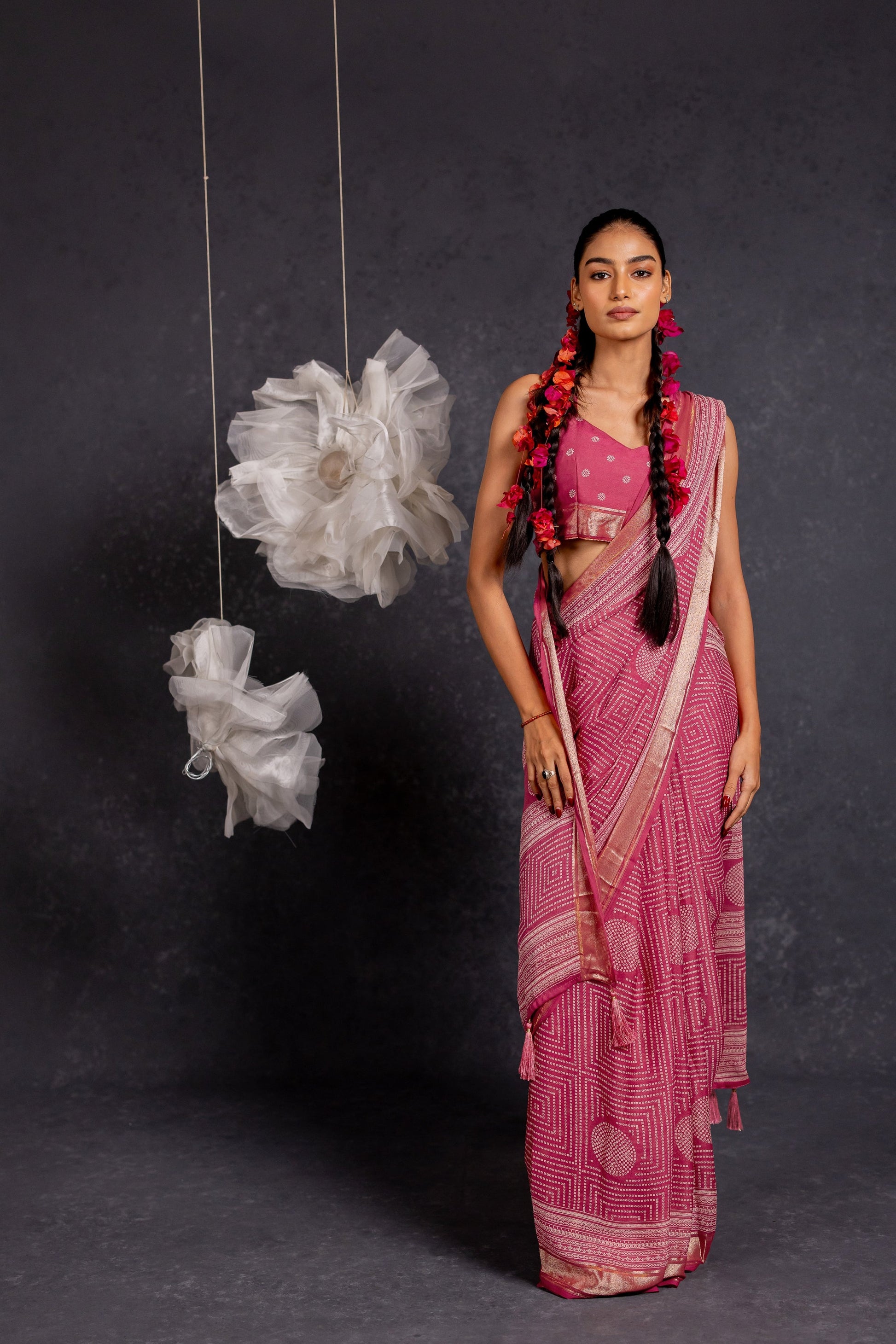 | This Bandhani Chiffon Saree is a beautiful and elegant blend of traditional Bandhani tie-dye art with the lightweight, airy fabric of chiffon. This is perfect to be worn during weddings, festive celebrations, and cultural events. The lightweight chiffon material makes it ideal for warm-weather occasions, while the Bandhani design adds a touch of heritage and craftsmanship. The look can be finished with traditional jewelry, like jhumkas or bangles, to elevate the outfit. |