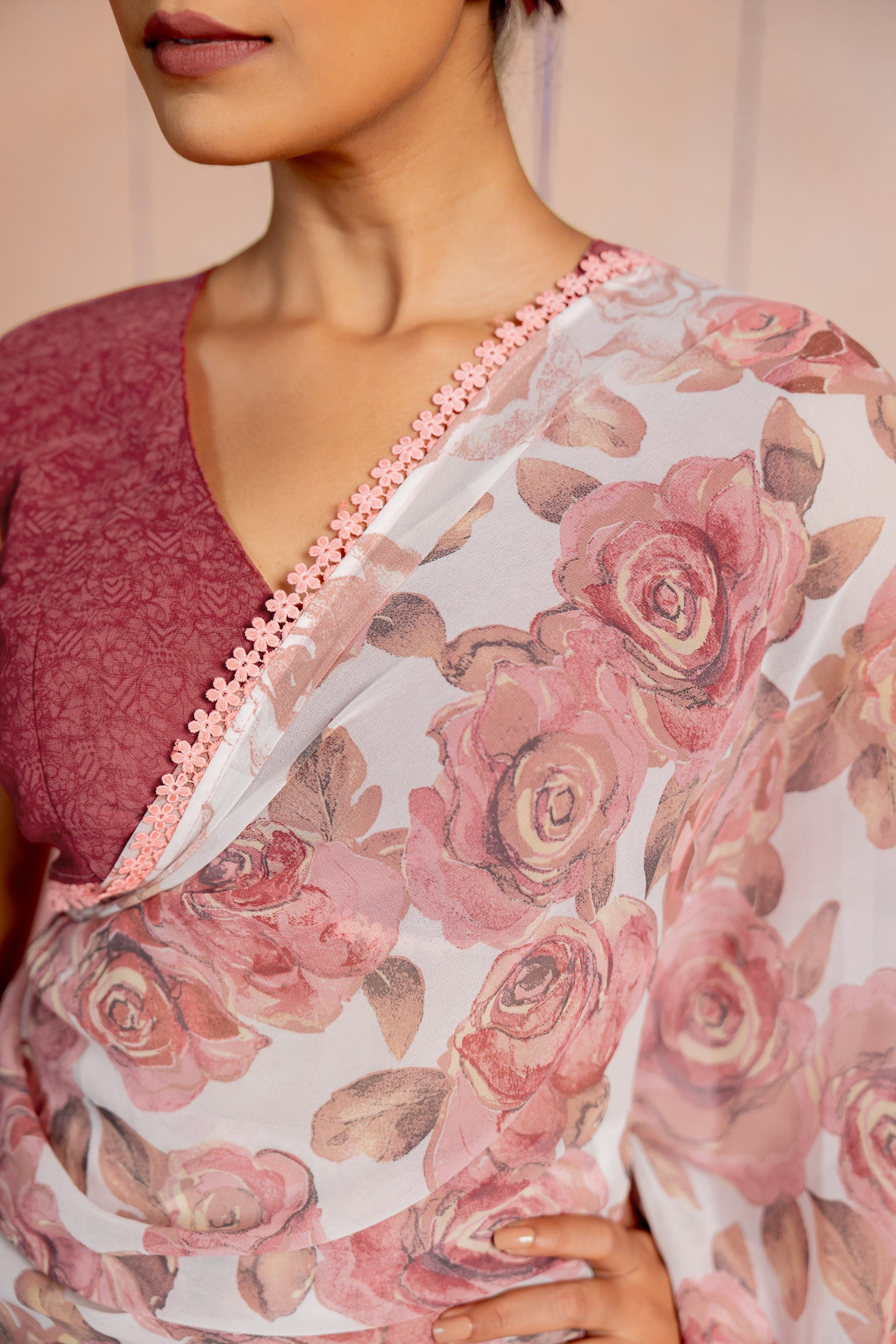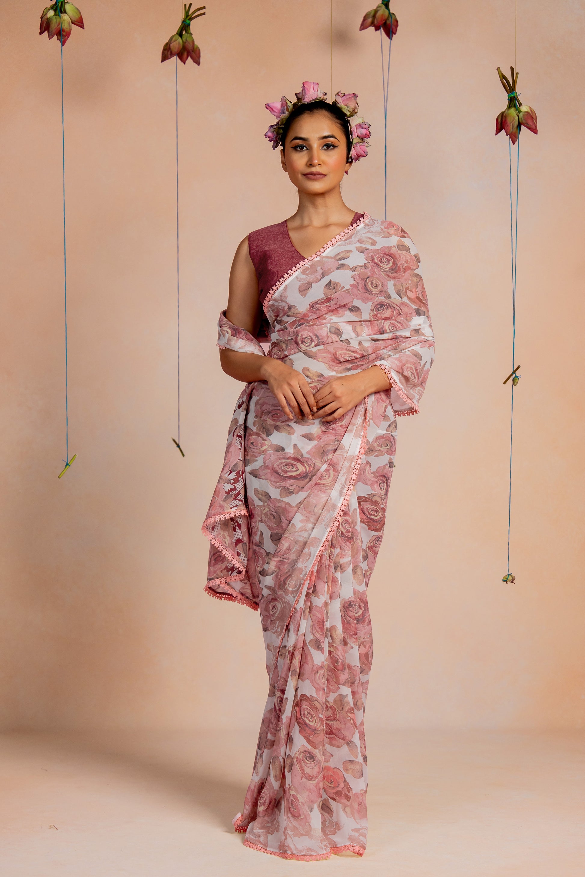 | A floral Georgette summer saree with crochet details blends the softness and breeziness of floral patterns with the intricate artistry of crochet, making it a truly unique and stylish choice. Accompanied by a 0.8-meter blouse piece that can be tailored to your exact size and fit, this saree ensures a custom-made and flawless appearance. This combination of floral prints and crochet details makes the saree perfect for daytime events like garden parties, brunches, or weddings, or office wear where a fresh, light, and sophisticated look is desired. |