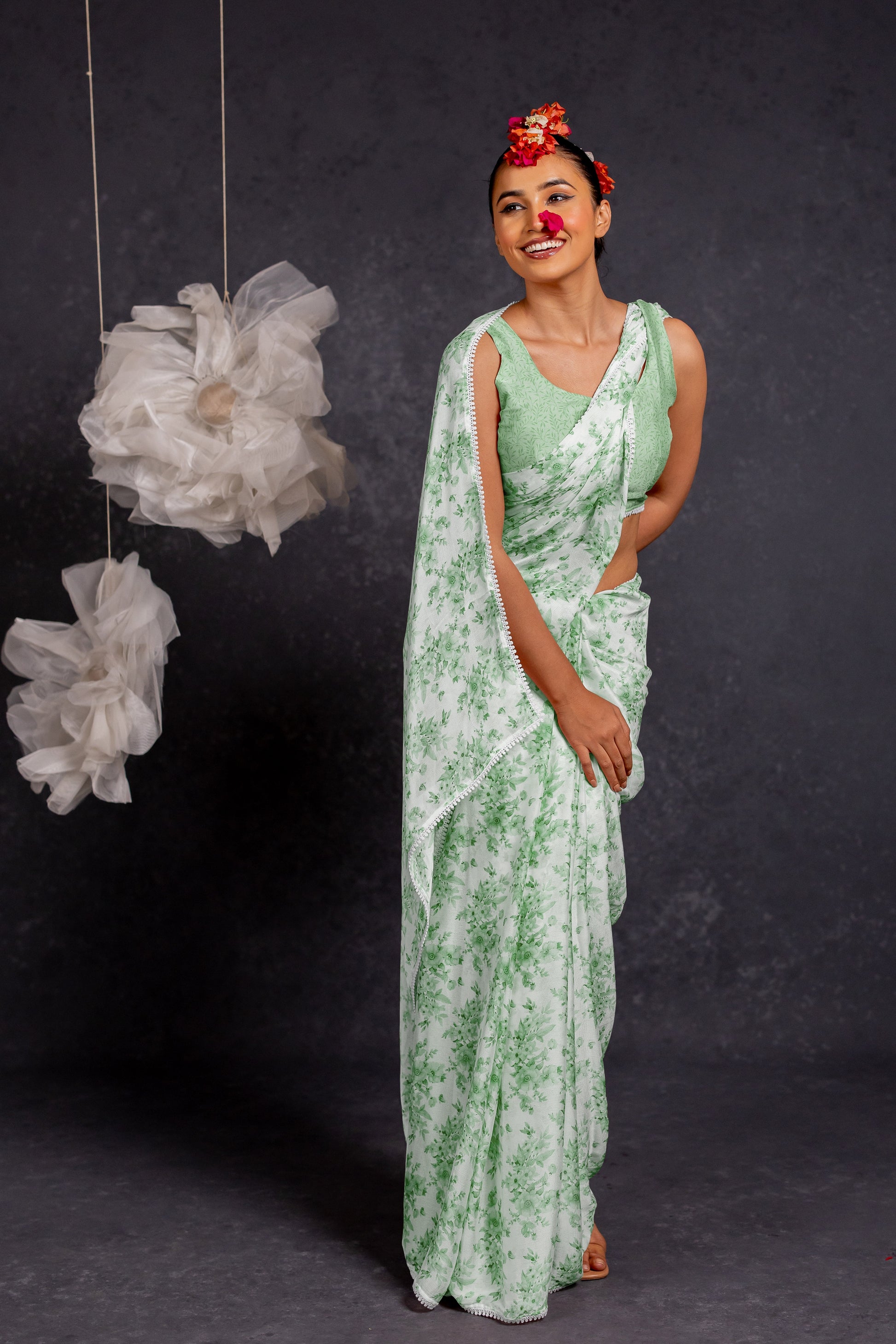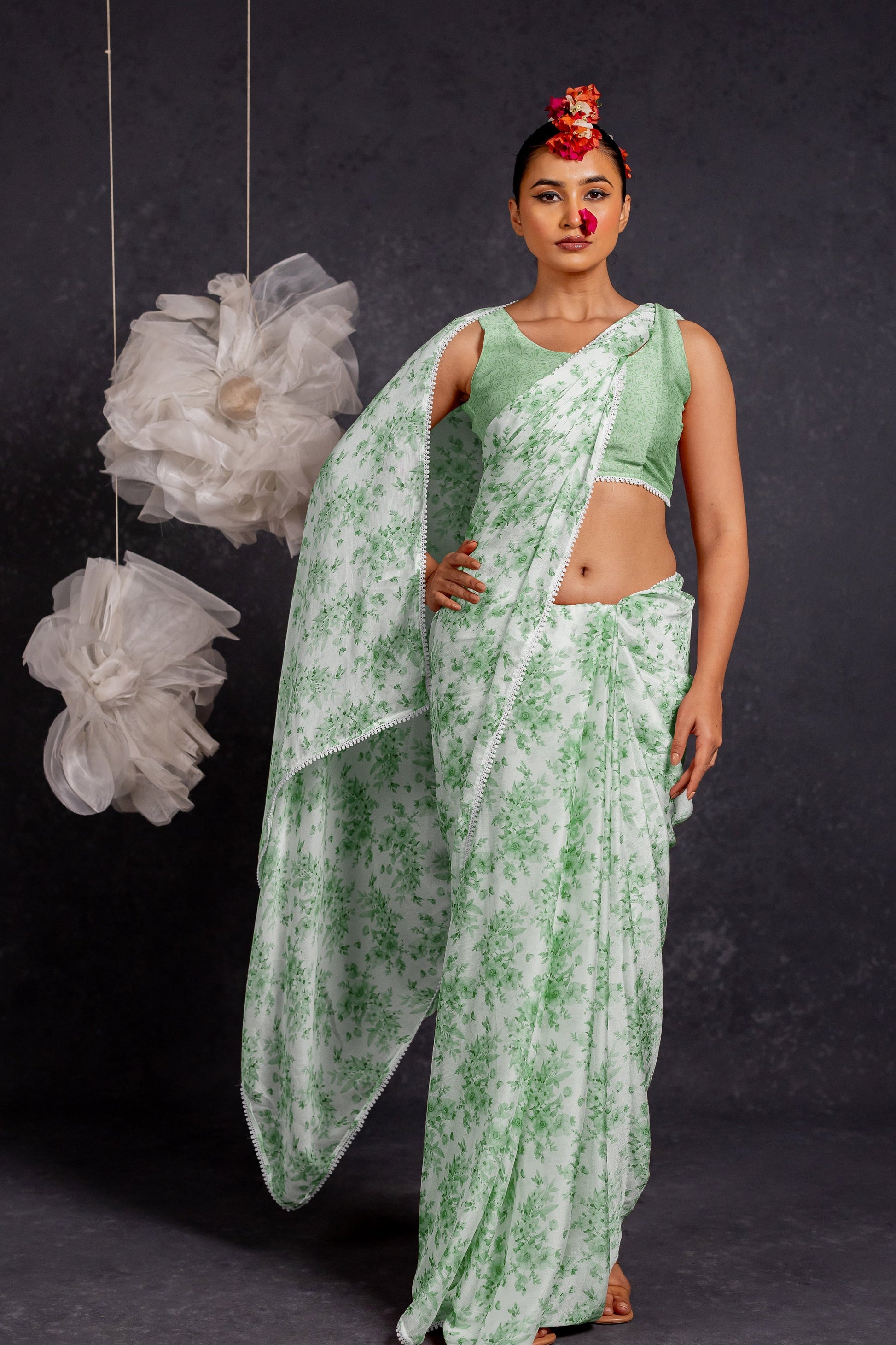 | A floral chiffon summer saree with crochet details blends the softness and breeziness of floral patterns with the intricate artistry of crochet, making it a truly unique and stylish choice. Accompanied by a 0.8-meter blouse piece that can be tailored to your exact size and fit, this saree ensures a custom-made and flawless appearance. This combination of floral prints and crochet details makes the saree perfect for daytime events like garden parties, brunches, or weddings, or office wear where a fresh, light, and sophisticated look is desired. |