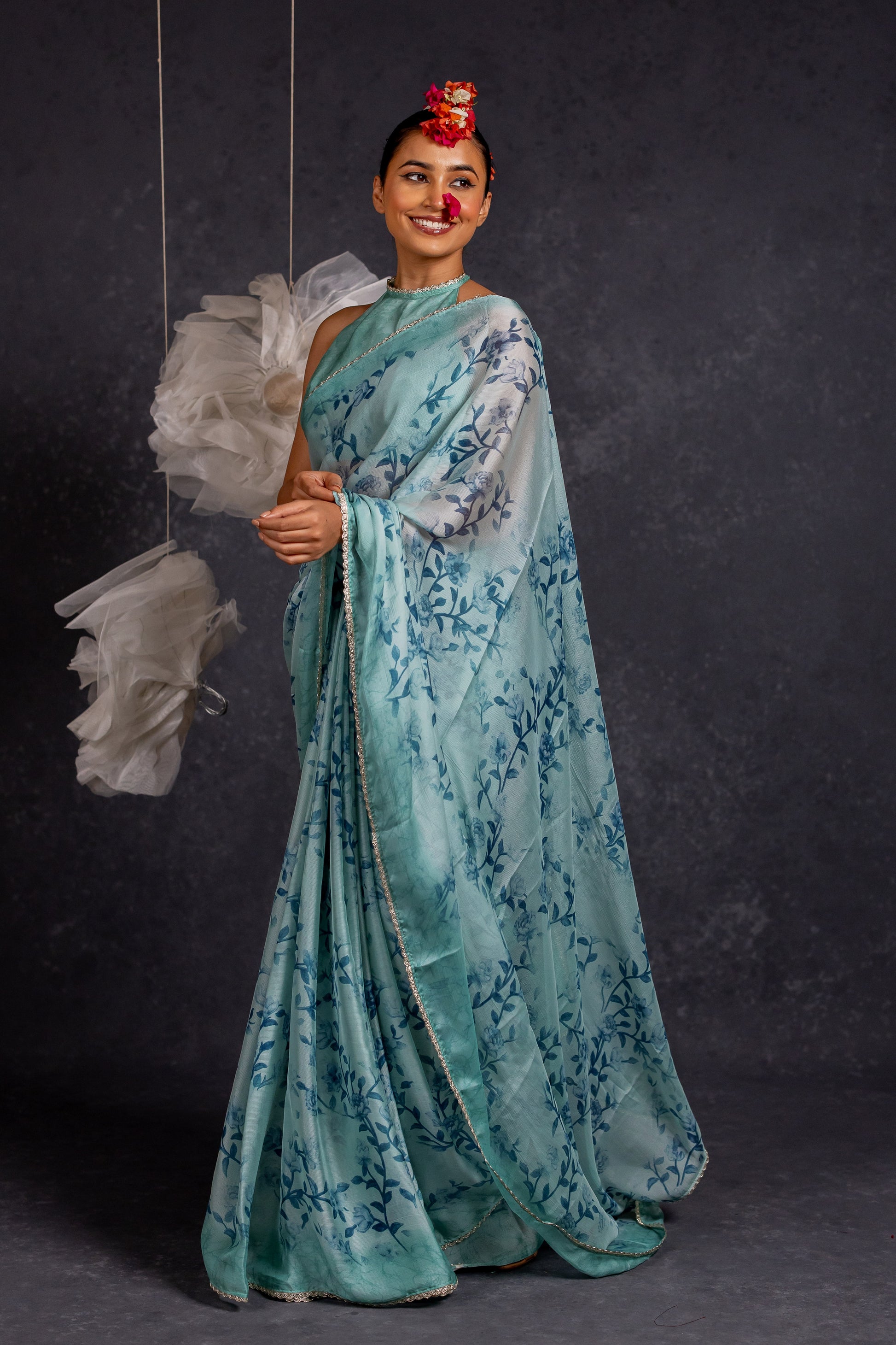 | A floral chiffon summer saree with lace details blends the softness and breeziness of floral patterns with the intricate Lace, making it a truly unique and stylish choice. Accompanied by a 0.8-meter blouse piece that can be tailored to your exact size and fit, this saree ensures a custom-made and flawless appearance. This combination of floral prints and lace details makes the saree perfect for daytime events like garden parties, brunches, or weddings, or office wear where a fresh, light, and sophisticated look is desired. |